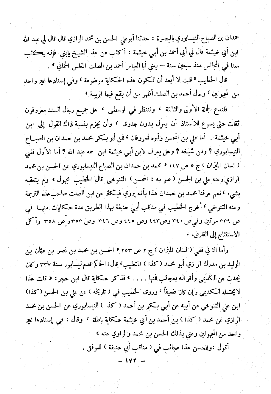 فلندع الجملة الأولى والثالثة ، ولننظر في الوسطى ، هل جميع رجال السند معروفون ثقات حتى يسوغ للأستاذ أن يعول بدون جدوى ، وأن يجزم بنسبة ذاك القوم إلى ابن أبي خيثمة . أما علي بن المحسن وأبوه معروفان ، فمن أبو بكر محمد بن حمدان بن الصباح النيسابوري ؟ ومن شيخه ؟ وهل يعرف لابن أبي خيثمة ابن اسمه عبد الله ؟ أما الأول ففي ( لسان الميزان ) ج 5 ص 147 (( محمد بن حمدان صباح بن النيسابوري عن الحسن بن محمد الرازي وعنه علي بن الحسن ( صوابه : المحسن ) التنوخي قال الخطيب مجهول )) ولم يتعقبه بشيء ، نعم عرفنا محمد بن حمدان هذا بأنه يروي فيكثر عن ابن الصلت صاحب هذه الترجمة وعنه التنوخي ، أخرج الخطيب في مناقب أبي حنيفة بهذا الطريق عدة حكايات منها في ص339 مرتين في ص340 وص443 وص445 وص346 وص353 وص358 وأكل الاستنتاج إلى القارئ .
