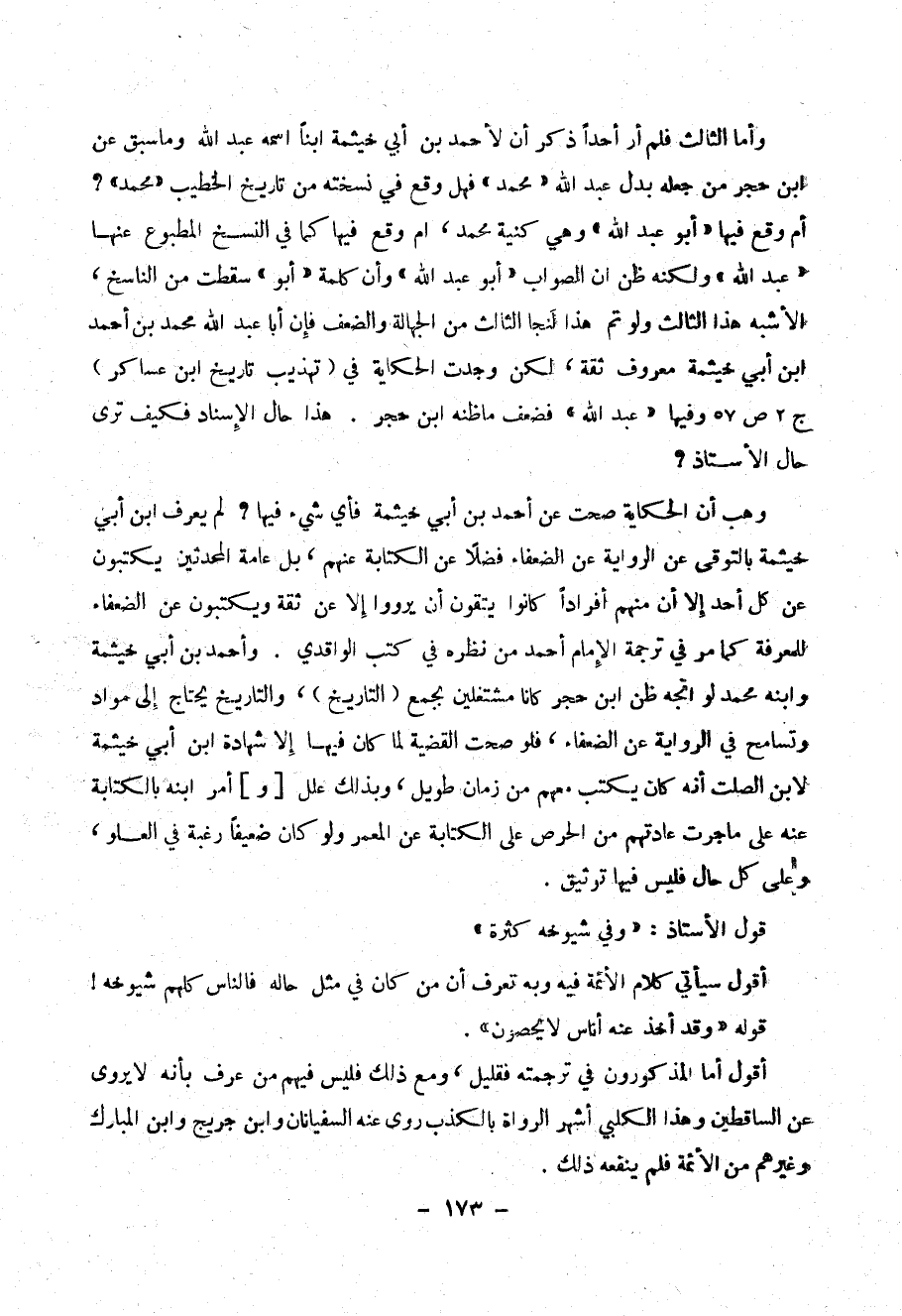 وأما الثالث فلم أر أحدا ذكر أن لأحمد بن أبي خيثمة ابناً اسمه عبد الله وما سبق عن ابن حجر من جعله بدل عبد الله (( محمد )) فهل وقع في نسخته من تاريخ الخطيب (( محمد )) ؟ أم وقع فيها (( أبو عبد الله )) وهي كنية محمد ، أم وقع فيها كما في النسخ المطبوع عنها (( عبد الله )) ولكنه ظن أن الصواب (( أبو عبد الله )) وأن كلمة (( أبو )) سقطت من الناسخ ، الأشبه هذا الثالث ولو تم هذا لنجا الثالث من الجاهلة والضعف فإن أبا عبد الله محمد بن أحمد بن أبي خيثمة معروف ثقة ، لكن وجدت الحكاية في ( تهذيب تاريخ ابن عساكر ) ج2 ص57 وفيها (( عبد الله )) فضعف ما ظنه ابن حجر . هذا حال الإسناد فكيف ترى حال الأستاذ ؟
