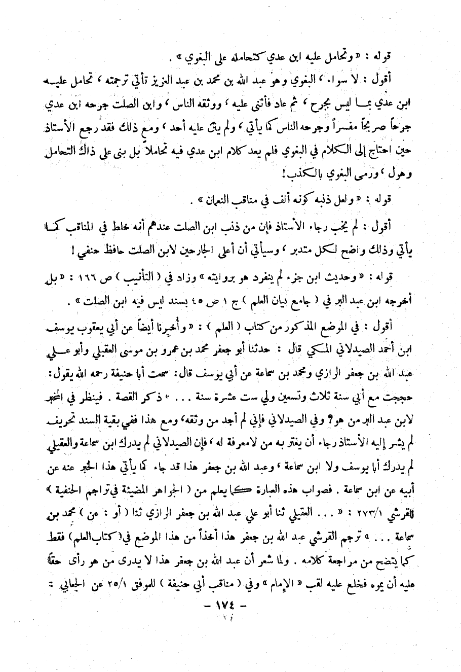 أقول : في الموضع المذكور من كتاب ( العلم ) : (( وأُخبِرنا أيضاً عن أبي يعقوب يوسف بن أحمد الصيدلاني المكي قال: حدثنا أبو جعفر محمد بن عمرو بن موسى العقيلي وأبو علي عبد الله بن جعفر الرازي ومحمد بن سماعة عن أبي يوسف قال : سمعت أبا حنيفة رحمه الله يقول :حججت مع أبي سنة ثلاث وتسعين ولي ست عشرة سنة .. )) ذكر القصة . فينظر في المخبر لابن عبد البر من هو؟ وفي الصيدلاني فإني لم أجد من وثقه، ومع هذا ففي بقية السند تحريف لم يشر إليه الأستاذ رجاء أن يغتر به من لا معرفة له ، فإن الصيدلاني لم يدرك ابن سماعة والعقيلي لم يدرك أبا يوسف ولا ابن سماعة ، وعبد الله ابن جعفر هذا قد جاء كما يأتي هذا الخبر عنه عن أبيه عن ابن سماعة ، وعبد الله بن جعفر هذا قد جاء كما يأتي هذا الخبر عنه عن أبيه عن ابن سماعة . فصواب هذه العبارة كما يعلم من ( الجواهر المضيئة في تراجم الحنفية ) للقرشي 1/ 273 : (( ... العقيلي ثنا أبو عبد الله بن جعفر الرازي ثنا ( أو : عن ) محمد بن سماعة .. )) ترجم القرشي عبد الله ابن جعفر هذا أخذاً من هذا الموضع في ( كتاب العلم ) فقط كما يتضح من مراجعة كلامه . ولما شعر أن عبد الله بن جعفر لا يدري من هو رأى حقا عليه أن يموه فخلع عليه لقب (( الإمام )) وفي ( مناقب أبي حنيفة ) للموفق 1/25 عن الجعابي :