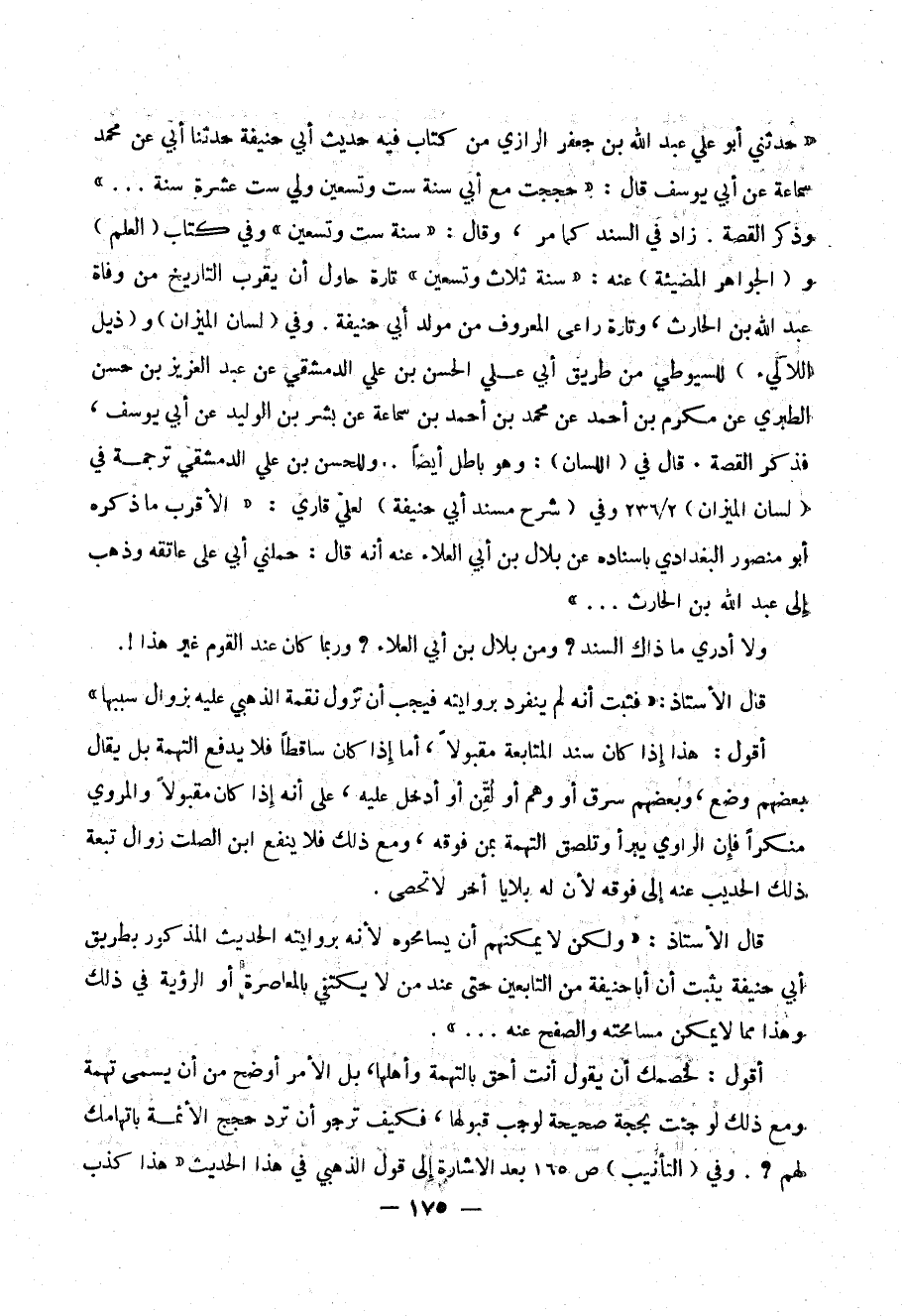 (( حدثني أبو علي عبد الله بن جعفر الرازي من كتاب فيه حديث أبي حنيفة حدثنا أبي عن محمد سماعة عن أبي يوسف قال : (( حججت مع أبي سنة ست تسعين ولي ست عشرة سنة ... )) وذكر القصة . زاد في السند كما مر ، وقال : (( سنة ست وتسعين )) وفي كتاب ( العلم ) و( الجواهر المضيئة ) عنه : (( سنة ثلاث وتسعين )) تارة حاول أن يقرب التاريخ من وفاة عبد الله بن الحارث ، وتارة راعى المعروف من مولد أبي حنيفة . وفي ( لسان الميزان ) و( ذيل اللآليء ) للسيوطي من طريق أبي علي الحسن بن علي الدمشقي عن عبد العزيز بن حسن الطبري عن مكرم بن أحمد عن محمد بن أحمد بن سماعة عن بشر ابن الوليد عن أبي يوسف ، فذكر القصة . قال في ( اللسان ) : وهو باطل أيضاً .. وللحسن بن علي الدمشقي ترجمة في ( لسان الميزان ) 2/236 وفي ( شرح مسند أبي حنيفة ) لعلي قاري : (( الأقرب ما ذكره أبو منصور البغدادي بإسناده عن بلال بن أبي العلاء عنه قال : حملني أبي على عاتقه وذهب إلى عبد الله بن الحارث ... ))