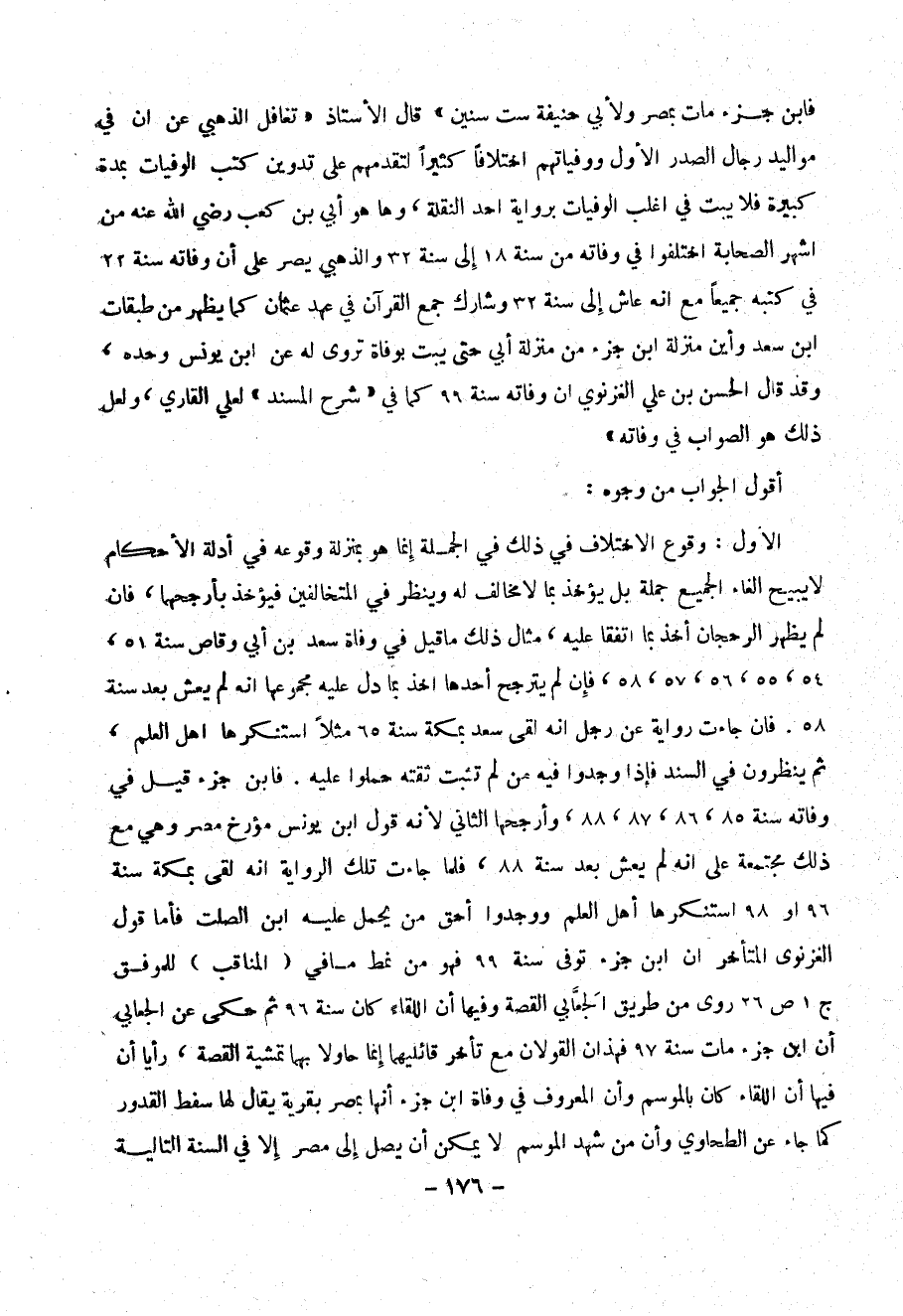 فابن جزء مات بمصر ولأبي حنيفة ست سنين )) قال الأستاذ (( تغافل الذهبي عن أن في مواليد رجال الصدر الأول ووفياتهم اختلافاً كثيراً لتقدمهم على تدوين كتب الوفيات بمدة كبيرة فلا يبت في أغلب الوفيات برواية أحد النقلة ، وها هو أبي بن كعب رضي الله عنه من أشهر الصحابة اختلفوا في وفاته من سنة 18 إلى سنة 32 والذهبي يصر على أن وفاته سنة 22 في كتبه جميعاً مع أن عاش إلى سنة 32 وشارك جمع القرآن في عهد عثمان كما يظهر من طبقات ابن سعد وأين منْزلة ابن جزء من منْزلة أبي حتى يبت بوفاة تروي له عن ابن يونس وحده ، وقد قال الحسن بن علي الغزنوي أن وفاته سنة 96 كما في (( شرح المسند )) لعلي القاري ، ولعل ذلك هو الصواب في وفاته )) .