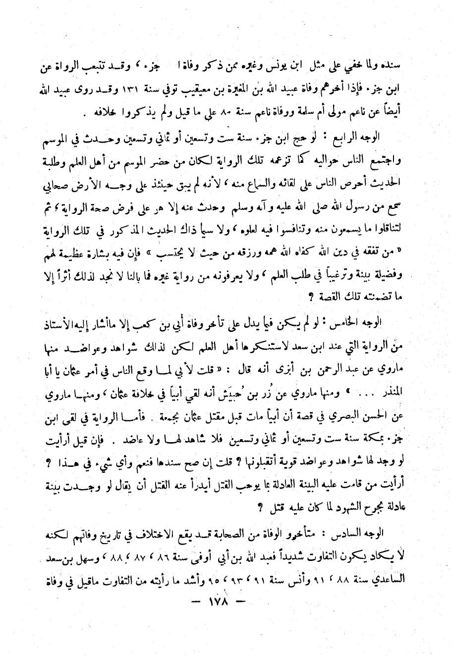 الوجه الخامس : لو لم يكن فيما يدل على تأخر وفاة أُبيّ بن كعب إلا ما أشار إليه الأستاذ من الرواية التي عند ابن سعد لاستنكرها أهل العلم لكن لذلك شواهد وعواضد منها ما روي عن عبد الرحمن بن أبزي أنه قال : (( قلت لأبي لما وقع الناس في أمر عثمان يا أبا المنذر - )) ومنها ما روى عن زر بن حبيش أنه لقي أُبياً في خلافة عثمان ، ومنها ما روي عن الحسن البصري في قصة أن أُبياً مات قبل مقتل عثمان بجمعة . فأما الرواية في لقى ابن جزء بمكة سنة ست وتسعين أو ثماني وتسعين فلا شاهد لها ولا عاضد . فإن قيل أرأيت لو وجد لها شواهد وعواضد قوية أتقبلونها ؟ قلت أن صح سندها فنعم وأي شيء في هذا ؟ أرأيت من قامت عليه البينة العادلة بما يوجب القتل أيدرأ عنه القتل أن يقال لو وجدت بينة عادلة بجرح الشهود لما كان عليه قتل ؟ .