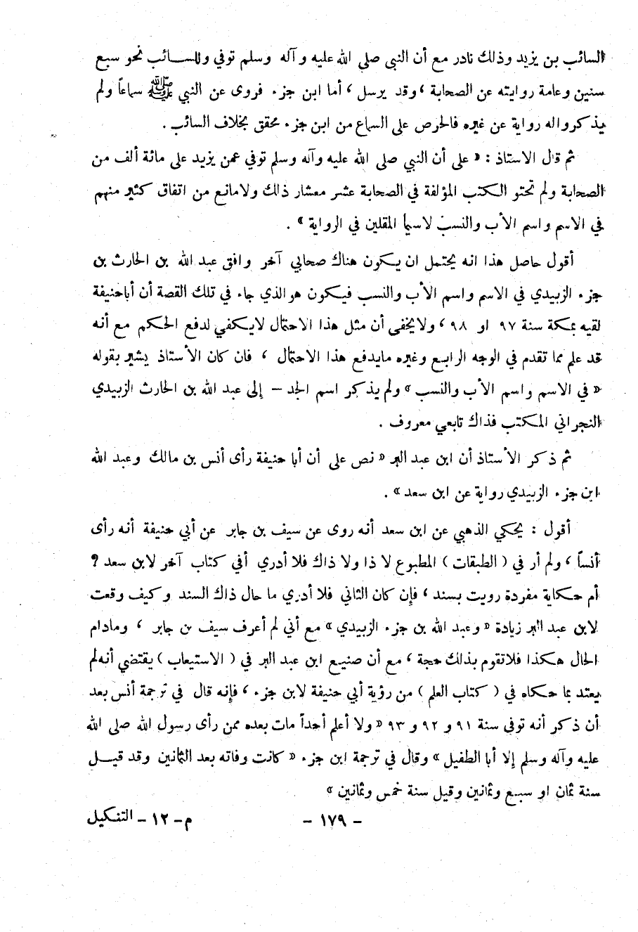أقول : يحكي الذهبي عن ابن سعد أنه روى عن سيف بن جابر عن أبي حنيفة أنه رأى أنساً ،ولم أر في ( الطبقات ) المطبوع لا ذا ولا ذاك فلا أدري أفي كتاب آخر لابن سعد؟ أم حكاية مفردة رويت بسند ، فإن كان الثاني فلا أدري ما حال ذاك السند وكيف وقعت لابن عبد البر زيادة (( وعبد الله بن جزء الزبيدي )) مع أني لم أعرف سيف بن جابر، وما دام الحال هكذا فلا تقوم بذلك حجة ، مع أن صنيع ابن عبد البر في ( الاستيعاب ) يقتضي أنه لم يعتد بما حكاه في ( كتاب العلم ) من رؤية أبي حنيفة لابن جزء ، فإنه قال في ترجمة أنس بعد أن ذكر أنه توفي سنة 91 و92 و93 (( ولا أعلم أحداً مات بعده ممن رأى رسول الله صلى الله عليه وآله وسلم إلا أبا الطفيل )) وقال في ترجمة ابن جزء (( كانت وفاته بعد الثمانين وقد قيل سنة ثمان أو سبع وثمانين سنة خمس وثمانين )) .