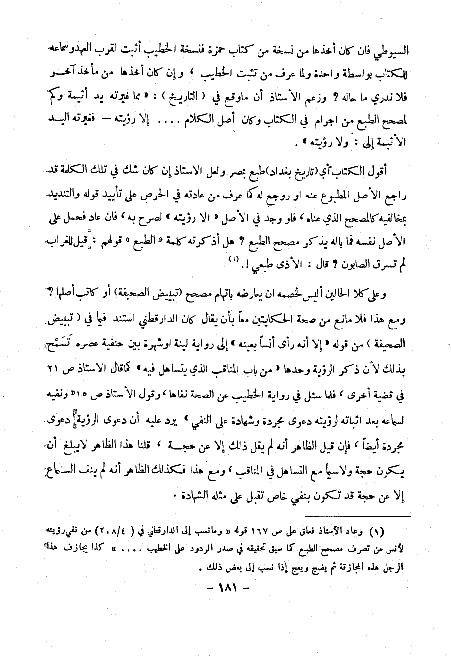 أقول الكتاب أي ( تاريخ بغداد ) طبع بمصر ولعل الأستاذ إن كان شك في تلك الكلمة قد راجع الأصل المطبوع عنه أو روجع له كما عرف من عادته في الحرص على تأييد قوله والتنديد بمخالفيه كالمصحح الذي عناه ، فلو وجد في الأصل (( إلا رؤيته )) لصرح به ، فإن عاد فحمل على الأصل نفسه فما باله يذكر مصحح الطبع ؟ هل أذكرته كلمة (( الطبع )) قولهم : قيل للغراب لم تسرق الصابون ؟ قال : الأذى طبعي ! . (1)