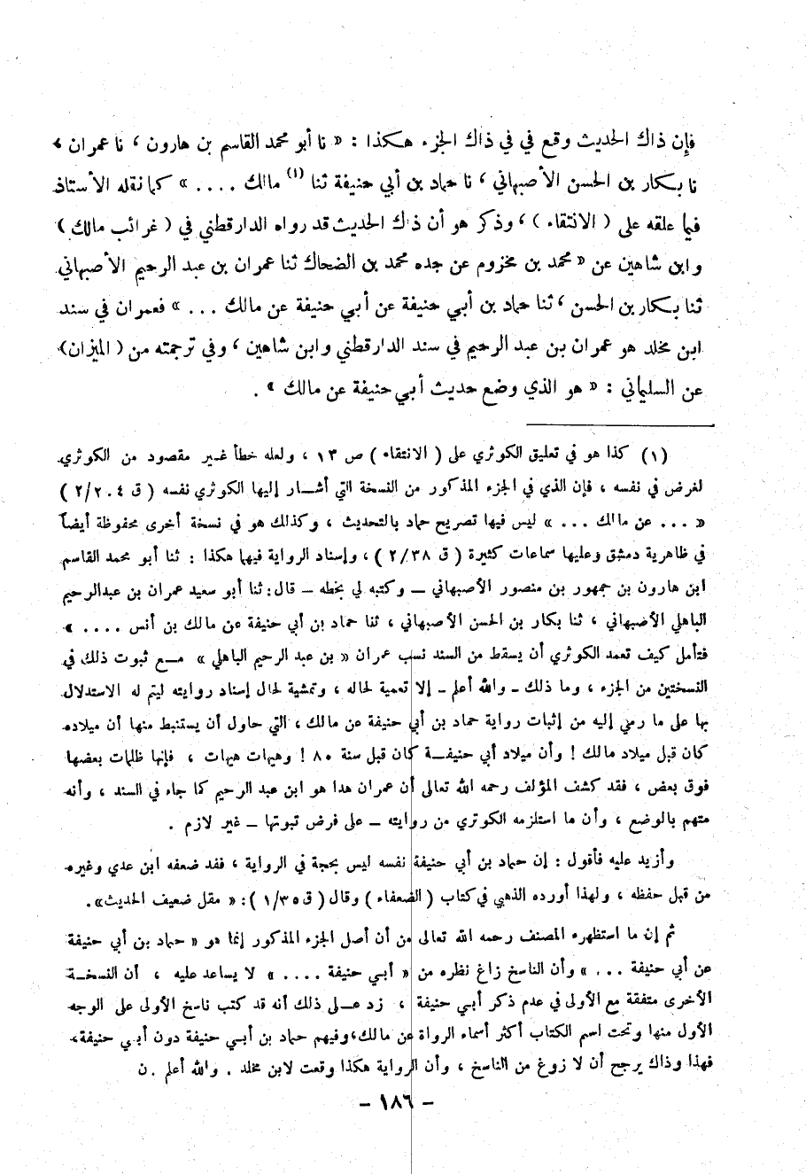 (1) ... كذا هو في تعليق الكوثري على ( الانتقاء ) ص 13، ولعله خطأ غير مقصود من الكوثري لغرض في نفسه، فإن الذي في الجزء المذكور من النسخة التي أثار إليها الكوثري نفسه ( ق 204 / 2 ) (( ... عن مالك ... )) ليس فيها تصريح حماد بالتحديث ، وكذلك هو في نسخة أخرى محفوظة أيضاً في ظاهرية دمشق وعليها سماعات كثيرة ( ق 38 / 2 ) ، وإسناد الرواية فيهما هكذا : ثنا أبو محمد القاسم ابن = =هارون بن جمهور بن منصور الأصبهاني ، ثنا حماد بن أبي حنيفة عن مالك بن أنس .... )) فتأمل كيف تعمد الكوثري أن يسقط من السند نسب عمران (( بن عبد الرحيم الباهلي )) مع ثبوت ذلك في النسختين من الجزء ، وما ذلك – والله أعلم – إلا تعمية لحاله ، وتمشية لحال إسناد روايته ليتم له الاستدلال بها على ما رمي إليه من إثبات رواية حماد بن أبي حنيفة عن مالك ، التي حاول أن يستنبط منها أن ميلاده كان قبل ميلاد مالك وأن ميلاد أبي حنيفة كان قبل سنة 80 ! وهيهات هيهات ، فإنها ظلمات بعضها فوق بعض ، فقد كشف المؤلف رحمه الله تعالى أن عمران هذا هو ابن عبد الرحيم كما جاء في السند ، وأنه متهم بالوضع ، وأن ما استلزمه الكوثري من روايته – على فرض ثبوتها – غير لازم .