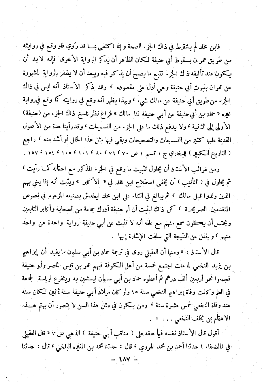 فابن مخلد لم يشترط في ذاك الجزء الصحة وإنما اكتفى بما روي فلو وقع في روايته من طريق عمران بسقوط أبي حنيفة لكان الظاهر أن يذكر الرواية الأخرى فإنه لا بد أن يكون عند تأليفه ذاك الجزء تتبع ما يصلح أن يذكر فيه ويبعد أن لا يظفر بالرواية المشهورة عن عمران أن بثبوت أبي حنيفة عن أبي حنيفة ثنا مالك )) فزاغ نظر ناسخ ذاك الجزء من ( حنيفة ) الأولى إلى الثانية ، ولا يدفع ذلك ما على الجزء من التسميعات ، وقد راينا عدة من الأصول القديمة عليها كثير من التسميات والتصحيحات وبقي فيها مثل هذا الخلل أو أشد منه ، راجع ( التاريخ الكبير ) للبخاري ج 1 قسم 1 ص70 ، 79 ، 80 ، 101، 105 ، 1540، 157 .