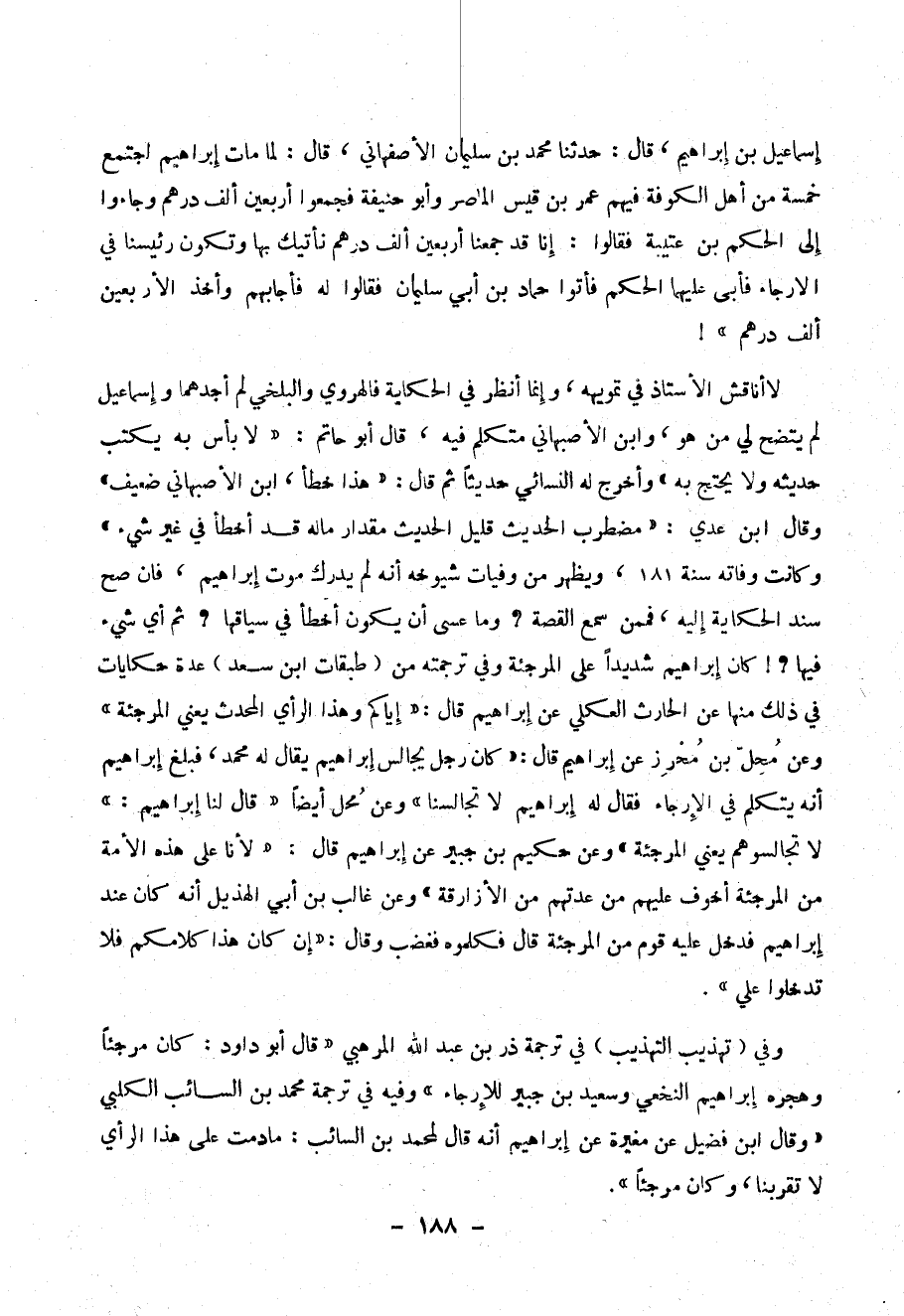وفي ( تهذيب التهذيب ) في ترجمة ذر بن عبد الله المرهبي (( قال أبو داود : كان مرجئاً وهجرة إبراهيم النخعي وسعيد بن جبير للإرجاء )) وفيه ترجمة محمد بن السائب الكلبي (( وقال ابن فضيل عن مغيرة عن إبراهيم أنه قال لمحمد بن السائب : ما دمت على هذا الرأي لا تقربنا ، وكان مرجئاً )) .