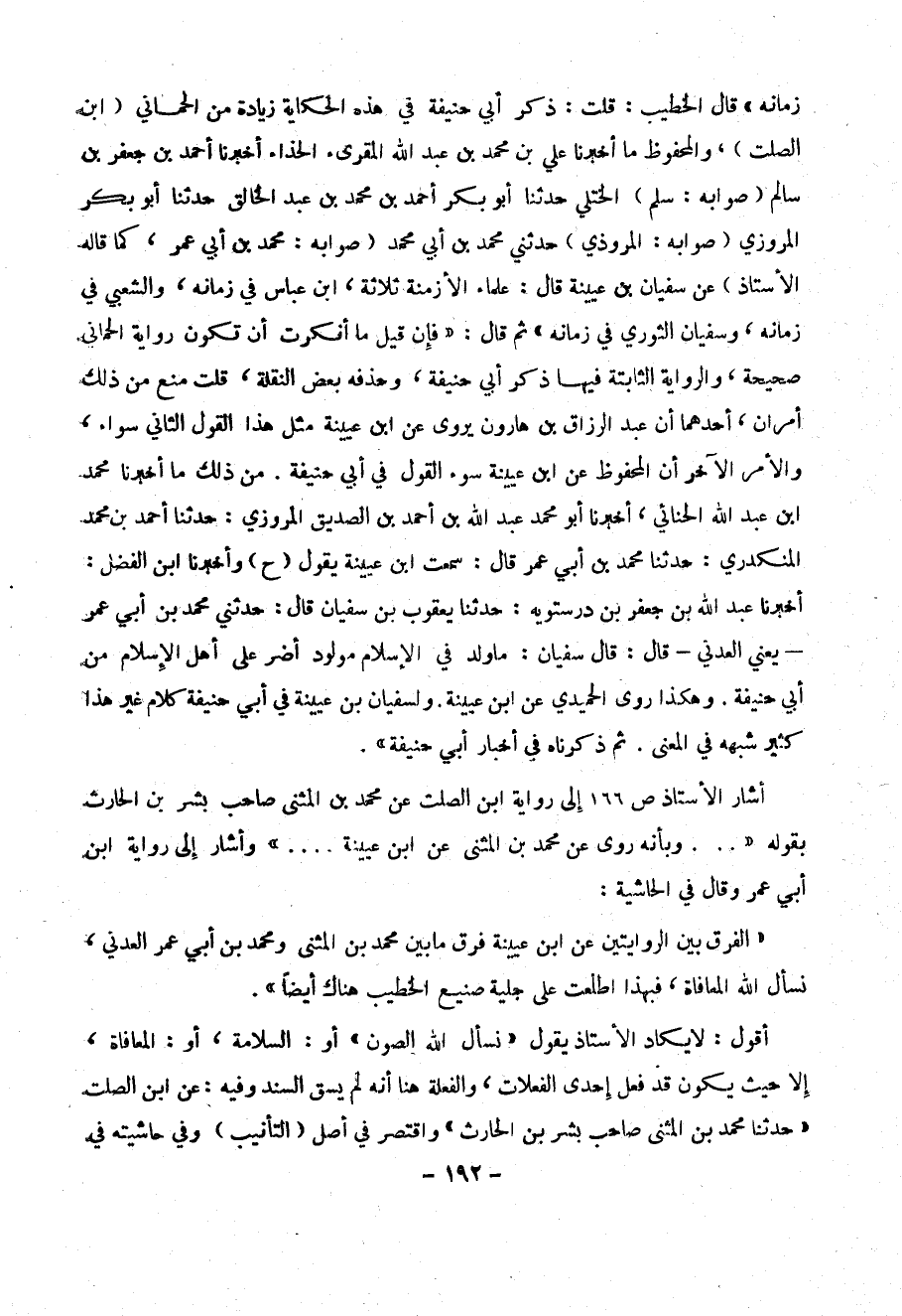 ثم روى الخطيب من طريق ابن الصلت: ((حدثنا محمد بن المثنى صاحب بشر بن الحارث قال: سمعت ابن عيينة قال: العلماء ابن عباس في زمانه، والشعبي في زمانه، وأبو حنيفة في زمانه)) قال الخطيب: قلت: ذكر أبي حنيفة في هذه الحكاية زياد من الحماني (ابن الصلت)، والمحفوظ ما أخبرنا علي بن محمد بن عبد الله المقرئ الحذاء أخبرنا أحمد بن جعفر بن سالم (صوابه: سلم) الختلي حدثنا أبو بكر أحمد بن محمد بن عبد الخالق حدثنا أبو بكر المروزي ((صوابه: المروذي)) حدثني محمد بن أبي محمد (صوابه: محمد بن أبي عمر، كما قاله الأستاذ) عن سفيان بن عيينة قال: علماء الأزمنة الثلاثة، ابن عباس في زمانه، والشعبي في زمانه، وسفيان الثوري في زمانه) ثم قال: ((فإن قيل ما أنكرت أن تكون رواية الحماني صحيحة، والرواية الثابتة فيها ذكر أبي حنيفة، وحذفه بعض النقلة، قلت: منع من ذلك أمران، أحدهما أن عبد الرزاق بن هارون يروي عن ابن عيينة مثل هذا القول الثاني سواء، والأمر الآخر أن المحفوظ عن أبي عيينة سوء القول في أبي حنيفة. من ذلك ما أخبرنا محمد بن عبد الله الحنائي، أخبرنا أبو محمد عبد الله بن أحمد بن الصديق المروزي: حدثنا أحمد بن محمد المنكدر: حدثنا محمد ابن أبي عمر قال: سمعت ابن عيينة يقول (ح) وأخبرنا ابن الفضل: أخبرنا عبد الله بن جعفر بن درستويه: حدثنا يعقوب بن سفيان قال: حدثني محمد بن أبي عمر - يعني العدني - قال: قال سفيان: ما ولد في الإسلام مولود أضر على أهل الإسلام من أبي حنيفة. وهكذا روى الحميدي عن ابن عيينة. ولسفيان بن عيينة في أبي حنيفة كلام غير هذا كثير شبهه في المعنى. ثم ذكرناه في أخبار أبي حنيفة)).