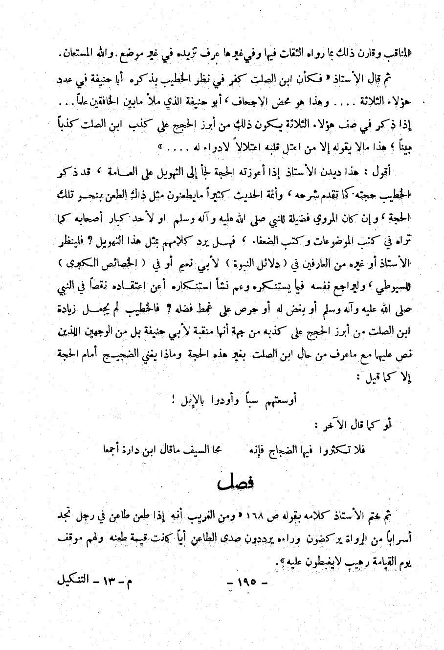 (الخصائص الكبرى) للسيوطي، وليراجع نفسه فيما يستنكر وعم نشا استناره أعن اعتقاد نقصاً في النبي صلى الله عليه وآله وسلم أو بغض له أو حرص على غمط فضله؟ فالخطيب لم يجعل زيادة ابن الصلت من أبرز الحجج على كذبه من جهة أنها منقبة لأبي حنيفة بل من الوجهيه اللذين نص عليهما مع ما عرف من حال ابن الصلت بغير هذه الحجة وماذا يغني الضجيج أمام الحجة إلا كما قيل: