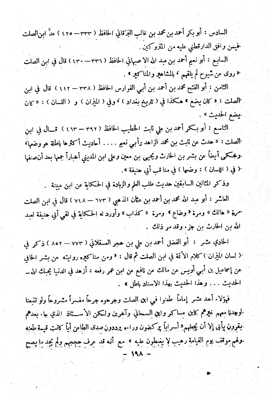 التاسع: أبو بكر بن علي بن ثابت الخطيب الحافظ (392 - 463) قال في ابن الصلت: ((حدث عن ثابت بن محمد الزاهد وأبي نعيم .... أحاديث أكثر باطلة هو وضعها، وحكى أيضاً عن بشر بن الحارث ويحيى بن معين وعلى ابن المديني أخباراً جمعها بعد أن صنفها ((في (اللسان): وضعها)) في مناقب أبي حنيفة)).