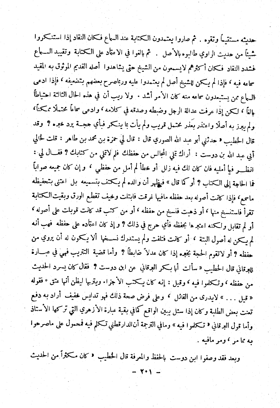 حديث مستقيماً وثقوه. ثم صاروا يعتمدون الكتابة عند السماع فكان النقاد إذا استنكروا شيئاً من حديث الراوي طالبوه بالأصل. ثم بالغوا في الاعتماد على الكتابة وتقيد السماع فشدد النقاد فكان أكثرهم لا يسمعون من الشيخ حتى يشاهدوا أصله القديم الموثوق به المقيد سمعه فيه، فإذا لم يكن للشيخ أصلاً لم يعتمدوا عليه وربما صرح بعضهم بتضعيفه، فإذا ادعى السماع ممن يستبعدون سماعه منه كان الأمر أشد. ولا ريب أن في هذا الحالة الثالثة احتياطاً بالغة، ولكن إذا عرفت عدالة الرجل وضبطه وصدقه في كلامه، وأدعى سماع محتملاً ممكن، ولن يبزر به أصلاً وأعتذر بعمل محتمل قريب ولم يأتي بما ينكر فبأي حجمة يرد خبره؟ وقد قال الخطيب ((حدثني ابن عبد الله الصوري قال: قال لي حمزة بن محمد بن طاهر: قلت لخالي أبي عبد الله بن دوست: أراك تملي المجالس من حفظك فلم لا تملي من كتابة؟ فقال لي: أنظر فيما أمليه فأن كان لك فيه زلل أو خطأ لم أملي من حفظي، وأن كان جميعه صواباً وما الحاجة إلى الكتاب؟ أو كما قال)) فيظهر أن والده لم يكتف بتسميعه بل أعتني بتحفيظه ما سمع، فإذا كانت أصوله بعد حفظه ما فيها غرقت فبتلت وخيفة تقطع الورق وبقية الكتابة تقرأ فستنسخ منها، وذهبت فنسخ من حفظه، أو من كتبت قد كانت قوبلت على أصوله، أو لم تقابل ولكنه أعتبرها بحفظه فأي حرج في ذلك؟ وإذا كان اعتماده على حفظه فهب أنه لم يكن له أصول البتة، أو كانت فتلفت ولم يستدرك نسخها إلا يكون له أن يروي من حفظه؟ أو لا تقوم الحجة بخبره إذا كان عدلاً ضابطاً؟ وأما قضية التتريب فهي في عبارة للبرقاني قال الخطيب ((سألت أبا بكر البرقاني عن ابن دوست؟ فقال كان يسرد الحديث من حفظة، وتكلموا فيه، وقيل: إنه كان يكتب الجزاء ويرتبها ليظن أنها عتق)) فقوله تعنت بعض الطلبة وكان إذا سئل يبين الواقع كما في بقية عبارة الأزهري التي تركها الأستاذ وأما قول البرقاني ((تكلموا فيه)) وما في الترجمة أن الدارقطني تكلم فيه فمحصول على ما صرحوا به مما مر، ومر ما فيه.
