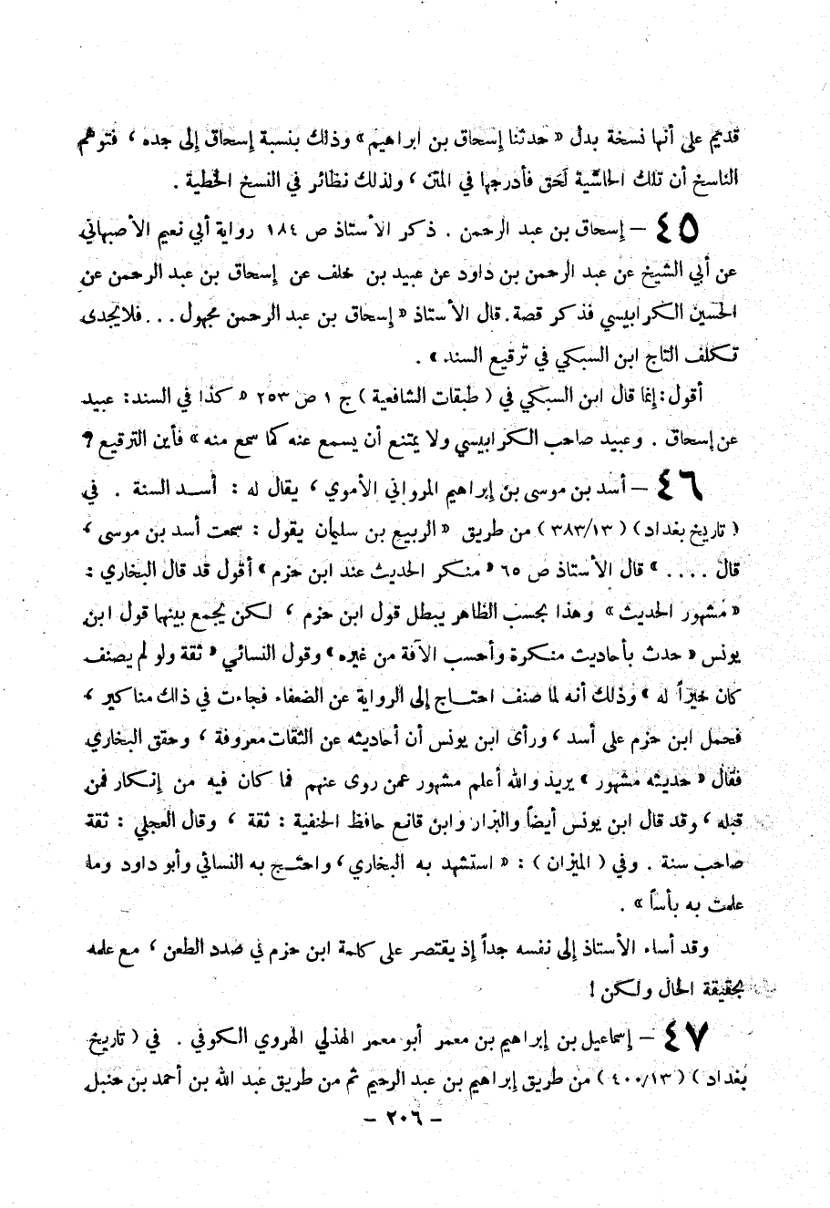 45 - إسحاق بن عبد الرحمن، ذكر الأستاذ ص 184 رواية أبي نعيم الأصبهاني عن أبي الشيخ عن عبد الرحمن بن داود عن عبيد بن خلف عن إسحاق بن عبد الرحمن عن الحسين الكرابيسي فذكر قصة. قال الأستاذ ((إسحاق بن عبد الرحمن مجهول ... فلا يجدي تكلف التاج ابن السبكي في ترقيع السند)).