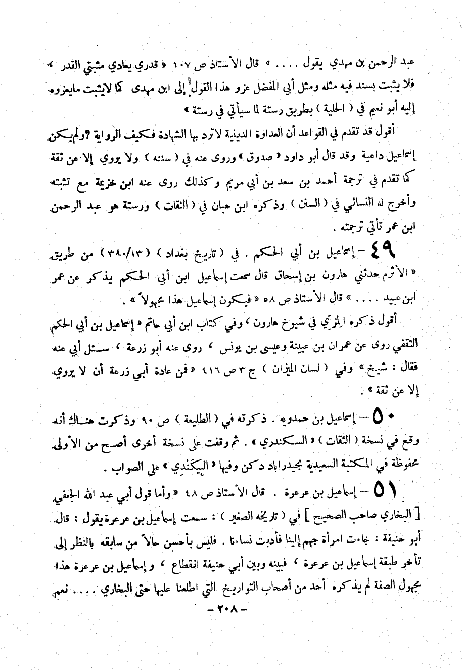 49 - إسماعيل بن أبي الحكم. في (تاريخ بغداد) (13/ 380) من طريق ((الأثرم حدثني هارون بن إسحاق قال سمعت إسماعيل بن أبي الحكم يذكر عن عمر ابن عبيد ... )) قال الأستاذ ص 58 ((فيكون إسماعيل هذا مجهولاً)).