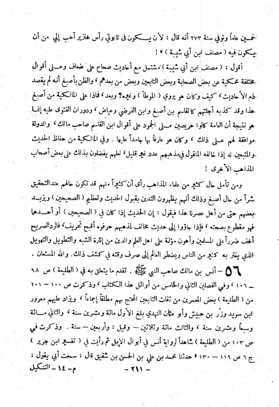 56- أنس بن مالك صاحب النبي - صلى الله عليه وسلم - . تقدم ما يتعلق به في ( الطليعة ) ص 98- 106 ، وفي الفصلين الثاني والخامس من أوائل هذا الكتاب ، وذكرت ص 100- 101 من ( الطليعة ) بعض المعمرين من ثقات التابعين المحتج بهم مطلقاً إجماعاً ، ويزاد عليهم مغرور ابن سويد وزر بن حبيش وأبو عثمان النهدي بلغ الأول مائة وعشرين سنة ، والثاني مائة وسيعاً وعشرين سنة ، والثالث مائة وثلاثين – وقيل : أربعين – سنة . وذكرت في ص 103 من ( الطليعة ) شاهداً لرواية أنس في أبوال الإبل ثم رأيت في ( تفسير ابن جرير ) ج 6 ص 119 – 130 (( حدثنا محمد بن علي بن الحسن بن شقيق قال : سمعت أبي يقول :