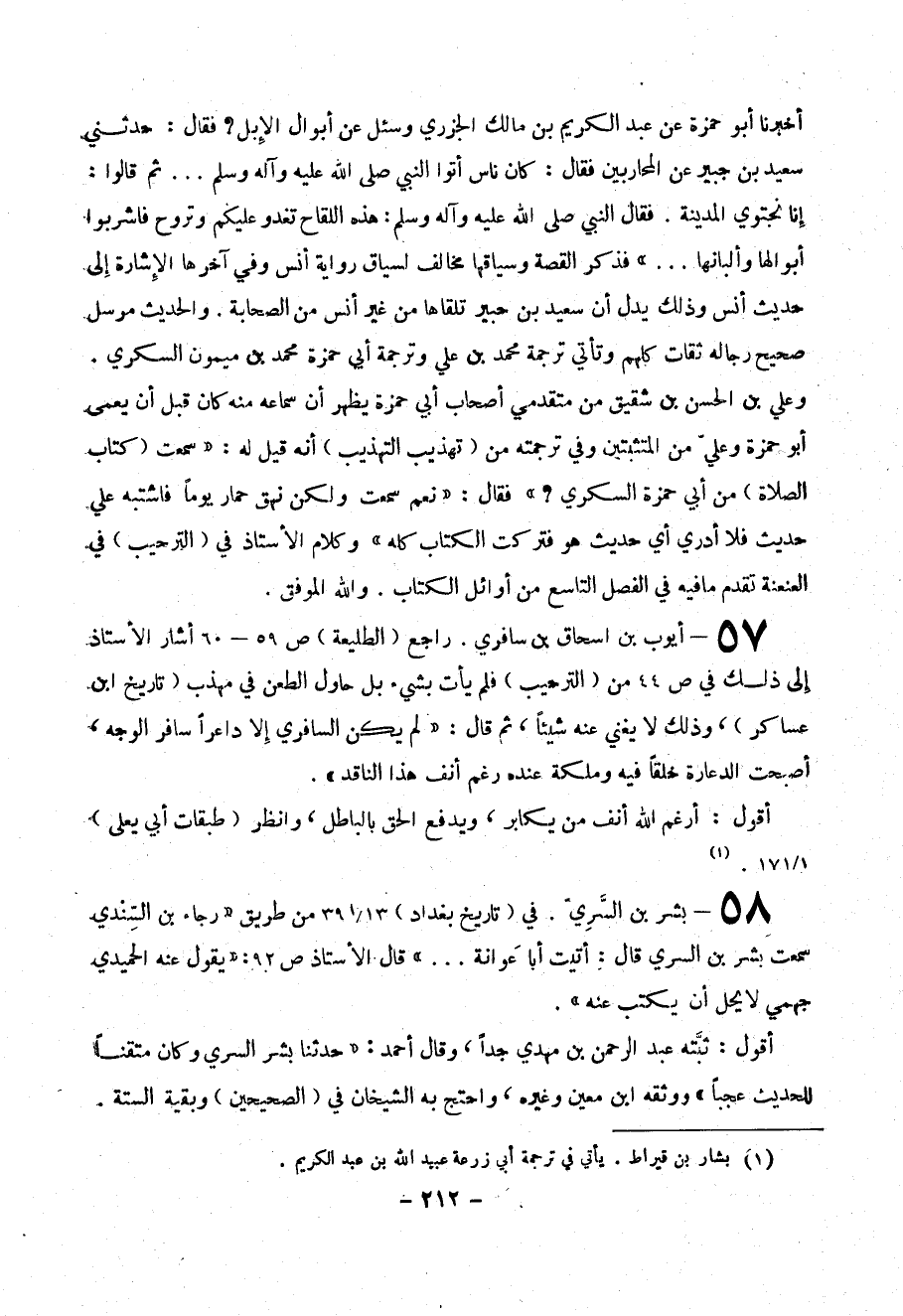 58- بشر بن السري . في ( تاريخ بغداد ) 13/391 من طريق (( رجاء بن السندي سمعت بشر بن السري قال : أتيت أبا عوانة .. )) قال الأستاذ ص92 : (( يقول عنه الحميدي جهمي لا يحل أن يكتب عنه )) .