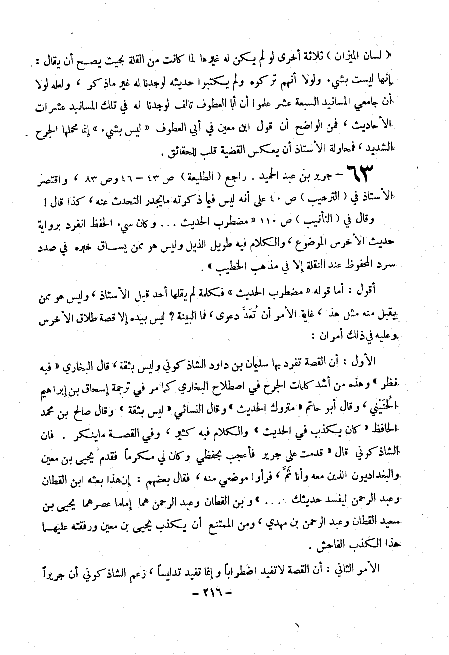 63- جرير بن عبد الحميد . راجع ( الطليعة ) ص 43 – 46 وص 83 ، واقتصر الأستاذ في ( الترحيب ) ص 40 على أنه ليس فيما ذكرته ما يجدر التحدث عنه ، كذا قال !
