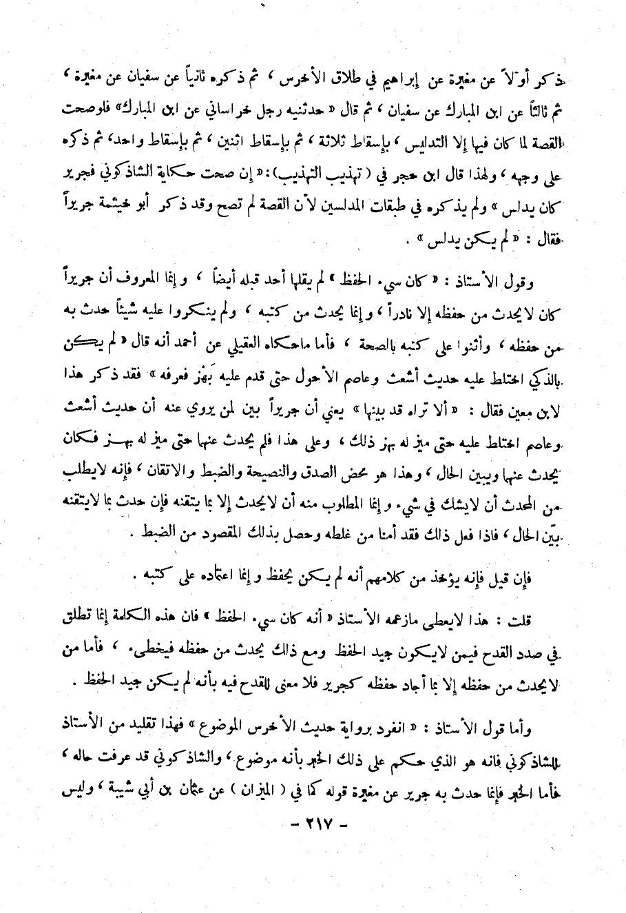 وقول الأستاذ : (( كان سيئ الحفظ لم يقلها أحد قبله أيضاً ، وإنما المعروف أن جريراً كان لا يحدث من حفظه إلا نادراً ، وإنما يحدث من كتبه ، ولم ينكروا عليه شيئاً حدث به من حفظه ، وأثنوا على كتبه بالصحة ، فأما ما حكاه العقيلي عن أحمد أنه قال (( لم يكن بالذكي اختلط عليه حديث أشعث وعاصم الأحول حتى قدم عليه بهز فعرفه )) فقد ذكر هذا لابن معين فقال : (( ألا تراه قد بينها )) يعني أن جريراً بين لمن بروي عنه أن حديث أشعث وعاصم اختلط عليه حتى ميز له بهز ذلك ، وعلى هذا فلم يحدث عنهما حتى ميز له بهز فكان يحدث عنهما ويبين الحال ، وهذا هو محض الصدق والنصيحة والضبط والإتقان ، فإنه لا يطلب من المحدث أن لا يشك في شيء وإنما المطلوب منه أن لا يحدث إلا بما يتقنه فإن حدث بما لا يتقنه بين الحال ، فإذا فعل ذلك فقد أمنا من غلطة وحصل بذلك المقصود من الضبط .