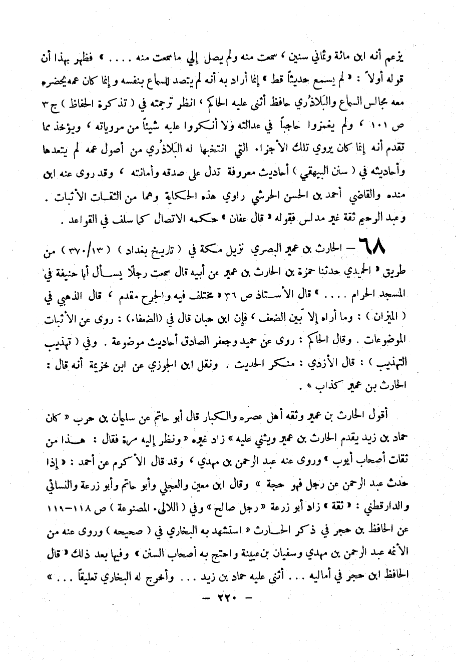 68- الحارث بن عمير البصري نزيل مكة في (( تاريخ بغداد )) (( 13/ 370 )) من طريق (( الحميدي حدثنا حمزة بن الحارث عن عمير عن أبيه قال سمعت رجل يسأل أبا حنفية في المسجد الحرام .... )) قال الأستاذ ص 36 (( مختلف فيه والجرح مقدم ، قال الذهبي (( الميزان )) : وما أراه إلا بين الضعف ، فإن ابن حبان قال في (( الضعفاء )): روى عن الإثبات والموضوعات . وقال الحاكم : روى عن حميد وجعفر الصادق أحاديث موضوعة . وفي (( تهذيب التهذيب )) : قال الأزدي : منكر الحديث . ونقل ابن الجوزي عن ابن خزيمة أنه قال : الحارث بن عمير كذاب )) .