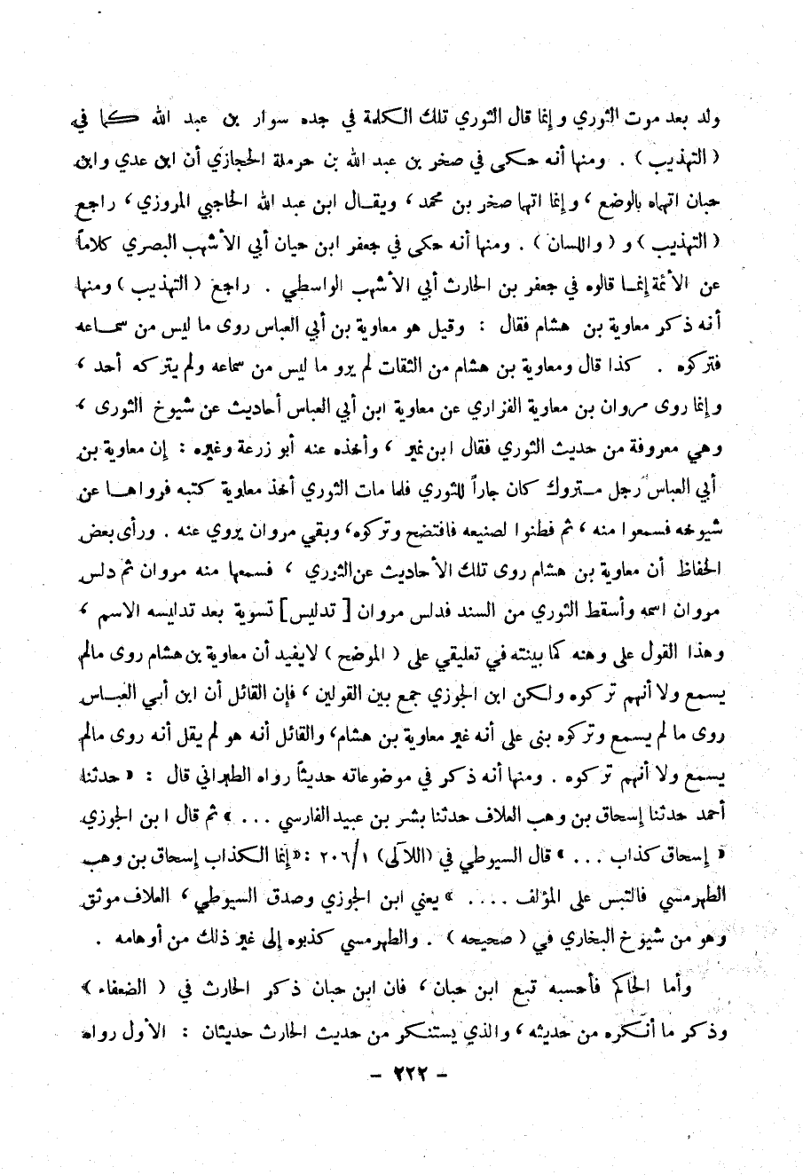ولد بعد موت الثوري وإنما قال الثوري تلك الكلمة في جده سوار بن عبد الله كما في ( التهذيب ) . ومنها أنه حكى في صخر بن عبد الله بن حرملة الحجازي أن ابن عدي وابن حبان اتهمته بالوضع ، وإنما اتهما حجر بن محمد ، ويقال ابن عبد الله الحاجي المروزوي ، راجع ( التهذيب ) و( اللسان ) . ومنها أنه حكى في جعفر ابن حبان أبي الشهب البصري كلاماً عن الأئمة قالوه في جعفر بن الحارث أبي الأشهب الواسطي . راجع ( التهذيب ) ومنها أنه ذكر معاوية بن هشام فقال: وقيل هو معاوية بن أبي العباس روى ما ليس من سماعه فتركوه . كذا قال ومعاوية بن هشام من الثقات لم يرو ما ليس من سماعه ولم يتركه أحد ، وإنما روى مروان بن معاوية الفزاري عن معاوية ابن أبي العباس أحاديث عن شيوخ الثوري وهي معروفة من حديث الثوري فقال ابن نمير ، وأخذه عنه أبو زرعه وغيره : إن معاوية بن أبي العباس رجل متروك كان جاراً للثوري فلما مات الثوري أخذ معاوية كتبه فرواها عن شيوخه فسمعوا منه ، ثم فطنوا لصنيعه فافتضح وتركوه ، وبقي مروان يروي عنه . ورأى بعض الحفاظ أن معاوية بن هشام روى تلك الأحاديث عن الثوري ، فسمعها منه مروان ثم دلس مروان اسمه وأسقط الثوري من السند فدلس مروان [ تدليس ] تسوية بعد تدليسه الاسم ، وهذا القول على وهنة كما بينته في تعليقي على ( الموضح ) لا يفيد أن معاوية بن هشام روى ما لم يسمع ولا أنهم تركوه بني على أنه ذكر في موضوعاته حديثاً رواه الطبراني قال : حدثنا أحمد حدثنا إسحاق بن وهب العلاف حدثنا بشر بن عبيد الفارسي ... )) ثم قال ابن الجوزي (( إسحاق كذاب ... )) قال السيوطي في ( اللآلي ) 1 / 206 : (( إنما الكذاب إسحاق بن وهب الطهرمسي فالتبس على المؤلف .... )) يعني ابن الجوزي وصدق السيوطي ، العلاف موثق وهو من شيوخ البخاري في ( صحيحه ) . والطهر مسي كذبوه إلى غير ذلك من أوهامه .