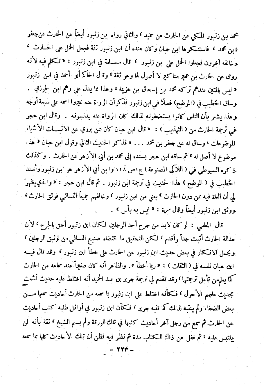 قال المعلمي : لو كان لا بد من جرح أحد ارجلين لكان ابن زنبور أحق بالجرح ، لأن عدالة الحارث أثبت جداً وأقدم ، ولكن التحقيق ما اقتضاه صنيع النسائي من توثيق الرجلين ، ويحمل الإنكار في بعض حديث ابن زنبور عن الحارث على خطأ ابن زنبور، وقد قال فيه ابن حبان نفسه في ( الثقات ) : (( ربما أخطأ )) . والظاهر أنه كان صغيراً عند سماعه من الحارث كما يعلم من تأمل ترجمتها ، وقد يقدم في ترجمة جرير ، فكأن ابن زنبور في أوائل طلبه كتب أحاديث عن الحارث ثم سمع من رجل آخر أحاديث كتبها في تلك الورقة ولم يسم الشيخ ، ثقة بأنه لن يلتبس عليه ، ثم غفل عن ذاك الكتاب مدة ثم نظر فيه فظن أن تلك الأحاديث كلها مما سمعه