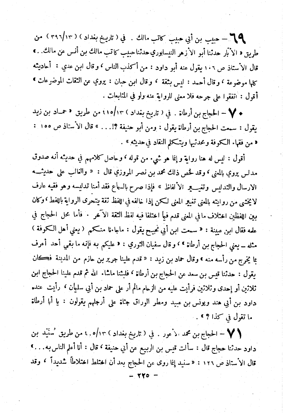 70- الحجاج بن أرطاة . في ( تاريخ بغداد ) 13 / 415 من طريق (( حماد بن زيد يقول : سمعت الحجاج بن أرطاة يقول : من أبو حنيفة ؟! .... )) قال الأستاذ ص155 : (( من فقهاء الكوفة ومحدثيها ويتكلم النقاد في حديثه )) .