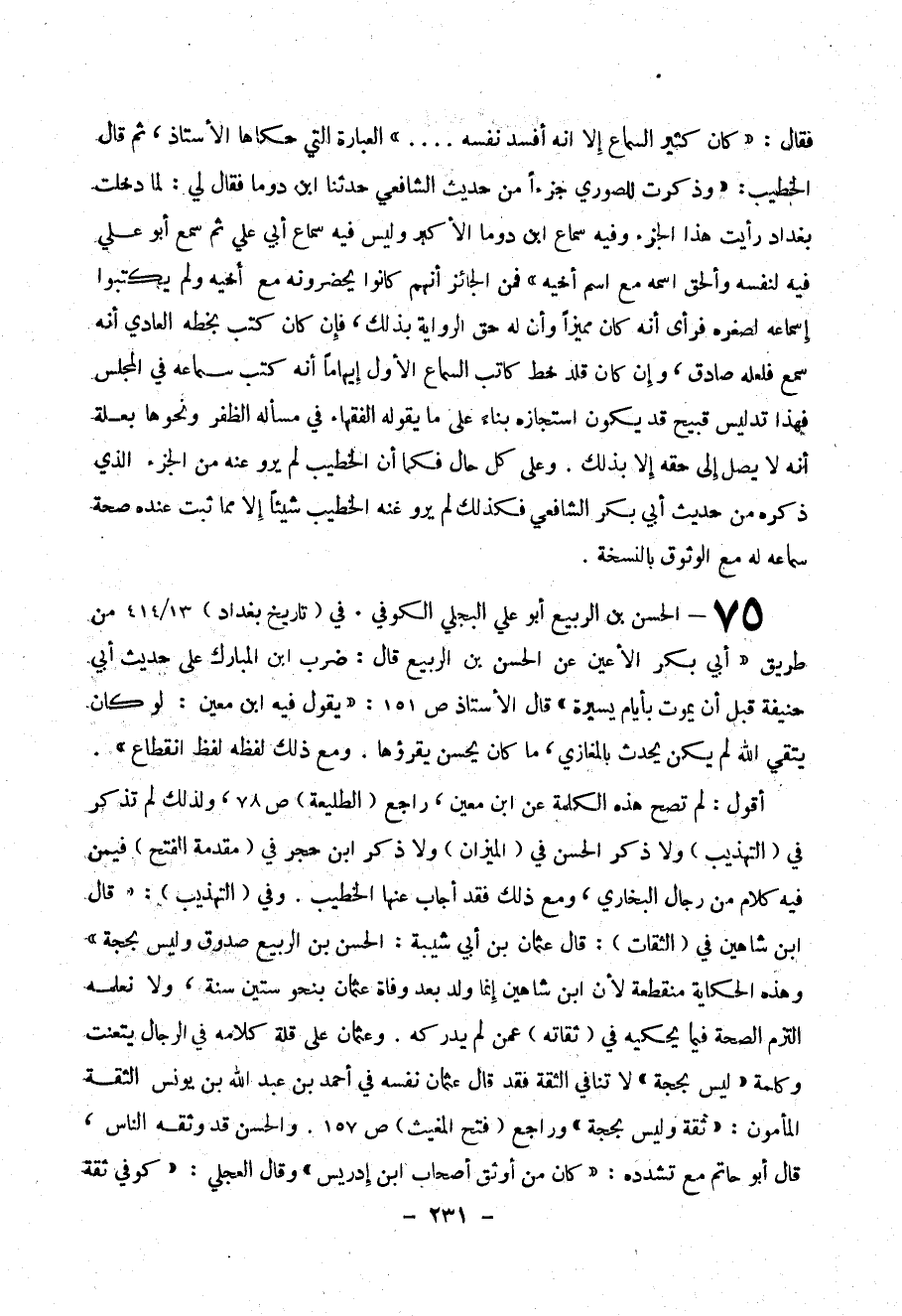 أقول : لم تصح هذه الكلمة عن ابن معين ، راجع ( الطليعة ) ص 78 ، ولذلك لم تذكر في ( التهذيب ) ولا ذكر الحسن في ( الميزان ) ولا ذكر ابن حجر في ( مقدمة الفتح ) فيمن فيه كلام من رجال البخاري ، ومع ذلك فقد أجاب عنها الخطيب . وفي ( التهذيب ) : قال ابن شاهين في ( الثقات ) : قال عثمان بن أبي شيبة : (( الحسن بن الربيع صدوق وليس بحجة )) وهذه الحكاية منقطعة فيما يحكيه في ( ثقاته ) عمن لم يدركه . وعثمان على قلة كلامه في الرجال يتعنت وكلمة (( ليس بحجة )) لا تنافي الثقة فقد قال عثمان نفسه في أحمد بن عبد الله بن يونس الثقة المأمون : (( ثقة وليس بحجة )) وراجع ( فتح المغيث ) ص 157 . والحسن قد وثقه الناس قال أبو حاتم تشدده : (( كان من أوثق أصحاب ابن إدريس )) وقال العجلي : (( كوفي ثقة