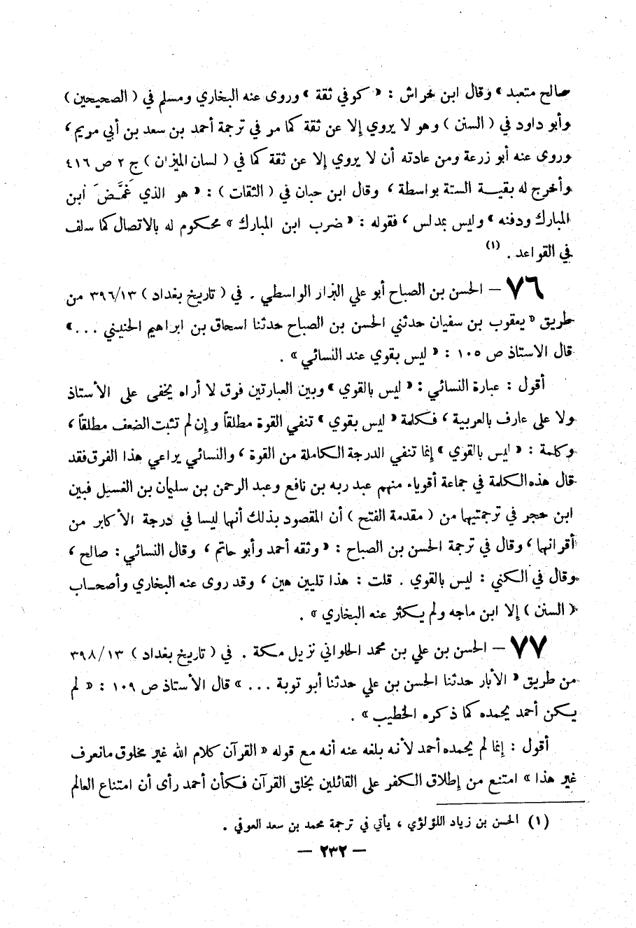77- الحسن بن علي بن محمد الحلواني نزيل مكة . في ( تاريخ بغداد ) 13/398 من طريق (( الأبار حدثنا الحسن بن علي ابن توبة ... )) قال الأستاذ ص 109 : (( لم يكن أحمد يحمده كما ذكره الخطيب )) .
