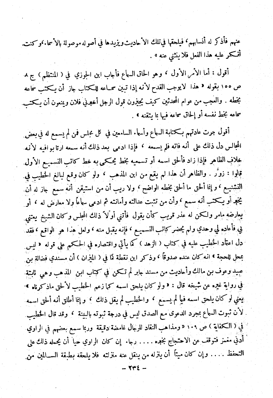 أقول : أما الأمر الأول ، وهو إلحاق السماع فأجاب ابن الجوزي في ( المنتظم ) ج 8 ص 155 بقوله (( هذا لا يوجب القدح لأنه إذا تبين سماعه للكتاب جاز أن يكتب سماعه بخطه . والعجب من عوام المحدثين كيف يجزون قول الرجل أخبرني فلان ويمنعون أن يكتب سماعه بخط نفسه أو إلحاق سماعه بما يتقنه )) .