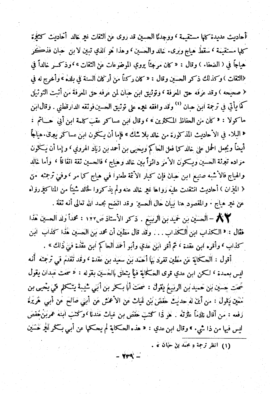 أحاديث عديدة كلها مستقيمة ، ووجدنا الحسين قد روى عن الثقات غير خالد أحاديث كثيرة كلها مستقيمة ، وسقط هياج وبرئ خالد والحسين ، وهذا هو الذي تبين لابن حبان فذكر هياجاً في ( الضعفاء ) وقال : (( كان مرجئاً يروي الموضوعات عن الثقات )) ، وذكر خالداً في ( الثقات ) وكذلك ذكر الحسين وقال : (( كان ركناً من أركان السنة في بلده )) واخرج له في ( صحيحه ) وقد عرفه حق المعرفة ، وتوثيق ابن حبان لمن عرفه حق المعرفة من اثبت التوثيق كما يأتي في ترجمة ابن حبان (1) وقد وافقه غيره على يوثيق الحسين فوثقه الدارقطني . وقال ابن مأكولا : (( كان من الحفاظ المكثرين )) وقال ابن عساكر عقب كلمة ابن أبي حاتم : (( البلاء في الأحاديث المذكورة من خالد بلا شك )) فإما أن يكون ابن عساكر يبرئ هياجاً أيضاً ويجعل الحمل على خالد كما فعل الحاكم ويحيى بن أحمد بن زياد الهروي ، وإما أن يكون مراده تبرئة الحسين ويكون الأمر دائراً بين وهياج ، فالحسين ثقة اتفاقاً ، وأما خالد والهياج فالأشبه صنيع ابن حبان فإن كبار الأئمة طعنوا في هياج كما مر ، وفي ترجمة من ( الميزان ) أحاديث انتدقت عليه رواها غير خالد عنه ولم يذكروا لخالد شيئاً من المناكير رواه عن غير هياج . والمقصود هنا بيان حال الحسين وقد اتضح بحمد الله تعالى أنه ثقة .