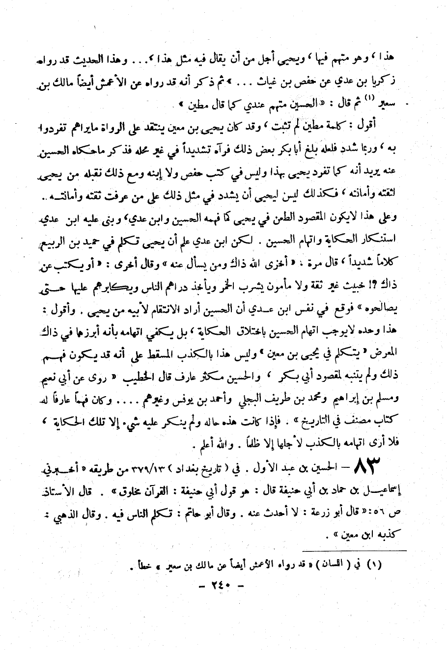 وعلى هذا لا يكون المقصود الطعن في يحيى كما فهمه الحسين وابن يحيى تكلم في حميد ابن الربيع كلاماً شديداً ، قال مرة . (( أخرى الله ذاك ومن يسأل عنه )) وقال أخرى : (( أو يكتب عن ذاك ؟ ! خبيث غير ثقة ولا مأمون يشرب الخمر ويأخذ دراهم الناس ويكابر هم عليها حتى يصالحوه )) فوقع في نفس ابن عدي أن الحسين أراد الانتقام لبيه من يحيى . وأقول : هذا وحده لا يوجب اتهام الحسين باختلاق الحكاية ، بل يكفي اتهامه بأنه أبرزها في ذاك المعرض (( يتكلم في يحيى بن معين )9 وليس هذا بالكذب المسقط على أنه قد يكون فهم ذلك ولم يتنبه لمقصود أبي بكر ، والحسين مكثر عارف قال الخطيب .... وكان فهماً عرفاً له كتاب مصنف في التاريخ )) . فإذا كانت هذه حاله ولم ينكر عليه شيء إلا تلك الحكاية ، فلا أرى اتهامه بالكذب لأجلها إلا ظلماً . والله أعلم .