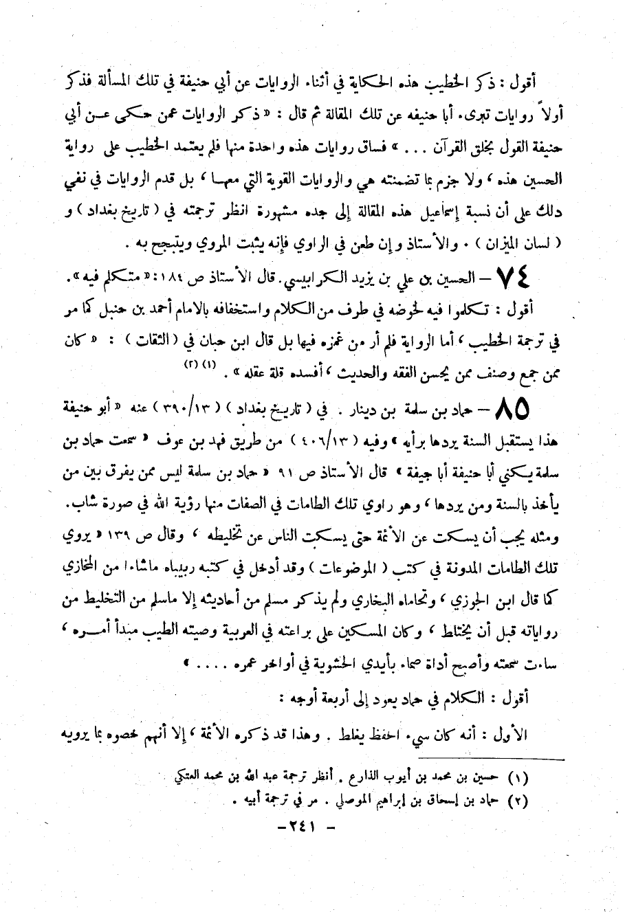 85- حماد بن سلمة بن دينار . في ( تاريخ بغداد ) ( 13/390 ) عنه (( أبو حنيفة هذا يستقبل السنة يردها برأيه )) وفيه ( 13/406) من طريق فهد بن عوف (( سمعت حماد بن سلمه يكني أبا حنيفة أبا جيفة )) قال الأستاذ ص 91 (( حماد بن سلمة ليس ممن يفرق بين من يأخذ بالسنة ومن يردها ، وهو راوي تلك الطامات في الصفات منها رؤية الله في صورة شاب ومثله يجب أن يسكت عن الأئمة حتى يسكت الناس عن تخليطه ، وقال ص 139 (( يروي تلك الطامات المدونة في كتب (الموضوعات ) وقد أدخل في كتبه ربيباه ما شاء / من المخازي كما قال ابن الجوزي ، وتحاماه البخاري ولم يذكر مسلم من أحاديثه إلا ما سلم من التخطيط من رواياته قبل أن يختلط ، وكان المسكين على راعته في العربية وصيته الطيب مبدأ أمره ، ساءت سمعته واصبح أداة صماء بأيدي الحشوية في أر أخر عمره .... ))