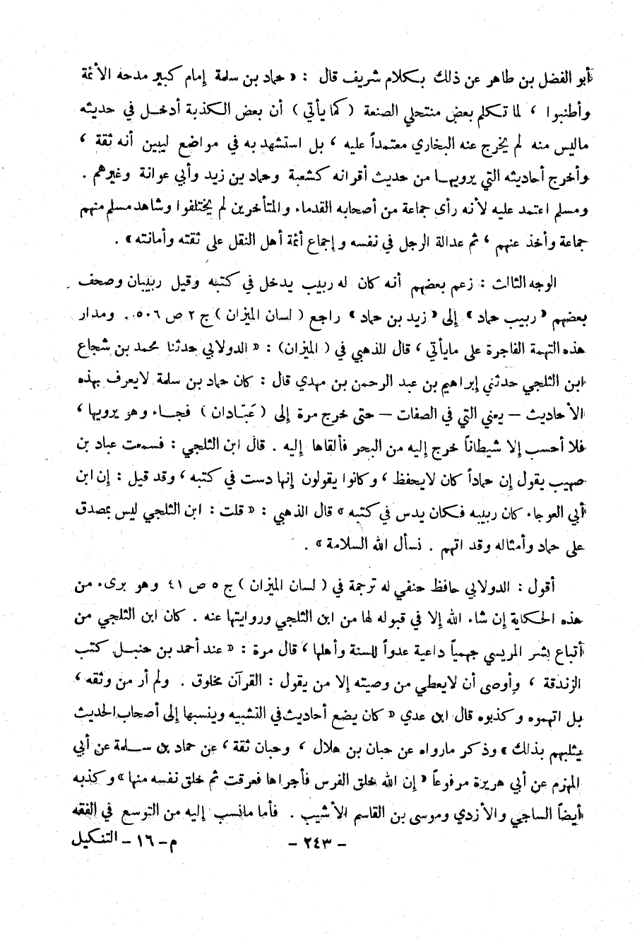 الوجه الثالث : زعم بعضهم انه كان له ربيب يدخل في كتبه وقيل ربيبان وصحف بعضهم (( ربيب حماد )) إلى (( زيد بن حماد )) راجع ( لسان الميزان ) ج 2 ص 506 . ومدار هذه التهمة الفاجرة على ما يأتي ، وقال الذهبي في ( الميزان ) : (( الدولابي حدثنا محمد بن شجاع ابن الثلجي حدثني إبراهيم بن عبد الرحمن بن مهدي قال : كان حماد بن سلمة لا يعرف بهذه الأحاديث – يعني التي في الصفات – حتى خرج مرة إلى ( عبادان ) فجاء وهو يرويها ، فلا أحسب إلا شيطاناً خرج إليه من البحر فألقاها إليه . قال ابن الثلجي : فسمعت عباد بن صهيب يقول إن حماداً كان لا يحفظ ، وكانوا يقولون إنها دست في كتبه ، وقد قيل : إن ابن أبي العوجاء كان ربيبه فكان يدس في كتبه )) قال الذهبي : (( قلت : ابن الثلجي ليس بمصدق على حماد وأمثاله وقد اتهم . نسأل الله السلامة )) .