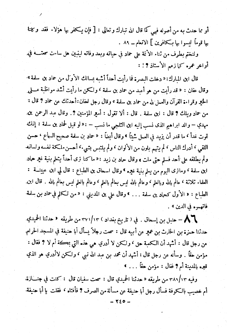 86- حنبل بن إسحاق . في ( تاريخ بغداد ) 13 / 371 من طريقه (( حدثنا الحميدي حدثنا حمزة بن الحارث بن عمير عن أبيه قال : سمعت رجلاً يسأل أبا حنيفة في المسجد الحرام عن رجل قال : اشهد أن الكعبة حق ، ولكن لا أدري هي هذه التي بمكة أم لا ؟ فقال : مؤمن حقاً . وسأله عن رجل قال : اشهد أن محمد بن عبد الله نبي ، ولكن لا أدري هو الذي قبره بالمدينة أم ؟ فقال : مؤمن حقاً - )) .
