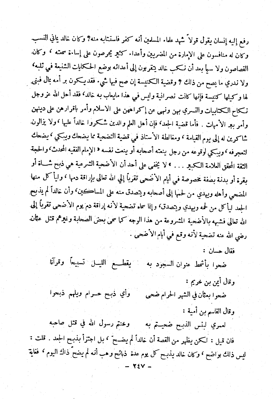 رفع إليه إنسان يقول قولا شهد علماء المسلمين انه كفر فاستتابه منه ؟ وكان خالد يملني النسب وكان له منافسون على الأمارة من المضريين واعداء كثير يحرصون على إساءة سمعة وكان القصاصون ولا سيما بعد ان نكب خالد يتقربون إلى أعدائه بوضع الحكايات الشنيعة في ثلبه ولا ندري ما يصح من ذلك ؟ وقضية الكنيسة إن صح فيها شيء فقد يكون برأمه بمال فبنى لها وكيلها كنيسة فإنها كانت نصرانية وليس في هذا ما يعاب به خالد فقد احل الله عز وجل نكاح الكتابيات والتسري بهن ونهى عن إكراههن على الإسلام وامر بإقرارهن على دينهن وامر ببر الأمهات . فآما قضية الجعد فإن أهل العلم وادين شكروا خالد عليها ولا يزالون شاكرين له إلى يوم القيامة ومغالطة الأستاذ في قضية التضحية مما يضحك ويبكي يضحك لتعجرفه ويبكي لوقوعه من رجل ينعته أصحابه أو ينعت نفسه (( الإمام الفقيه المحدث والحجة الثقة المحقق العلامة الكبير ... )) لا يخفي على أحد أن الضحية الشرعية هي ذبح شاه أو بقرة أو بدنة بصفة مخصوصة في أيام الأضحي تقربا إلى الله تعالى بإراقة دمها ، وليأكل منها المضحي وأهله ويهدي من لحمها إلى أصحابه ويتصدق على المساكين ، وأن خالداً لم يذبح الجعد ليأكل من لحمه ويهدي ويتصدق ، وإنما سماه تضحية لأنه إراقة دم يوم الضحى تقرباً إلى الله تعالى فشبهه بالضحية المشروعة من هذا الوجه كما سمى بعض الصحابة وغيرهم قتل عثمان رضي الله عنه تضحية لأنه وقع في أيام الضحى .