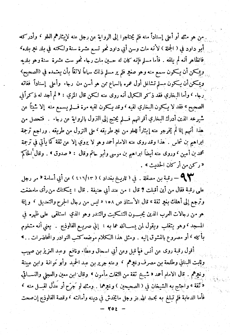 93- رقبة بن مصقلة . في ( تاريخ بغداد ) ( 13 / 416 ) عن أبي أسامة (( مر رجل على رقبة فقال من أين أقبلت ؟ قال ؟ من عند أبي حنيفة . قال : يمكنك من رأى ما مضغت وترجع إلى أهلك بغير ثقة )) قال الأستاذ ص 158 (( ليس من رجال الجرح والتعديل ، وإنما هو من رجالات العرب الذين يحبون التنكيت والتندر وهو الذي استلقى على ظهره في المسجد ، وهو يتقلب ويقول لمن يسائله عما به : إني صريع الفالوذج . يعني أنه متخوم بأكله ، أو مصروع بالتشوق إليه . ومثل هذا الكلام موضعه كتب النوادر والمحاضرات .. ))