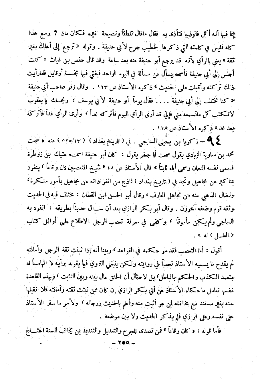 94- زكريا بن يحيى الساجي . في ( تاريخ بغداد ) ( 13/325 ) عنه (( سمعت محمد ابن معاوية الزبادي يقول سمعت أبا جعفر يقول : كان أبو حنيفة اسمه عتيك بن زوطرة فسمى نفسه النعمان وسمى أباه ثابتاً )) قال الأستاذ ص18 (( شيخ المتعصبين كان وقوعاً، ينفرد بمناكير عن مجاهيل وتجد في ( تاريخ بغداد ) نماذج من انفراداته عن مجاهيل بأمور منكرة ، ونضال الذهبي عنه من تجاهل العارف ، وقال أبو الحسن ابن القطان : مختلف فيه في الحديث وثقه قوم وضعفه آخرون. وقال أبو بكر الرازي بعد أن ساق الحديث بطريقه: انفرد به الساجي ولم يكن مأموناً ، وكفى في معرفة تعصب الرجال الاطلاع على أوائل كتاب ( العلل ) له )) .