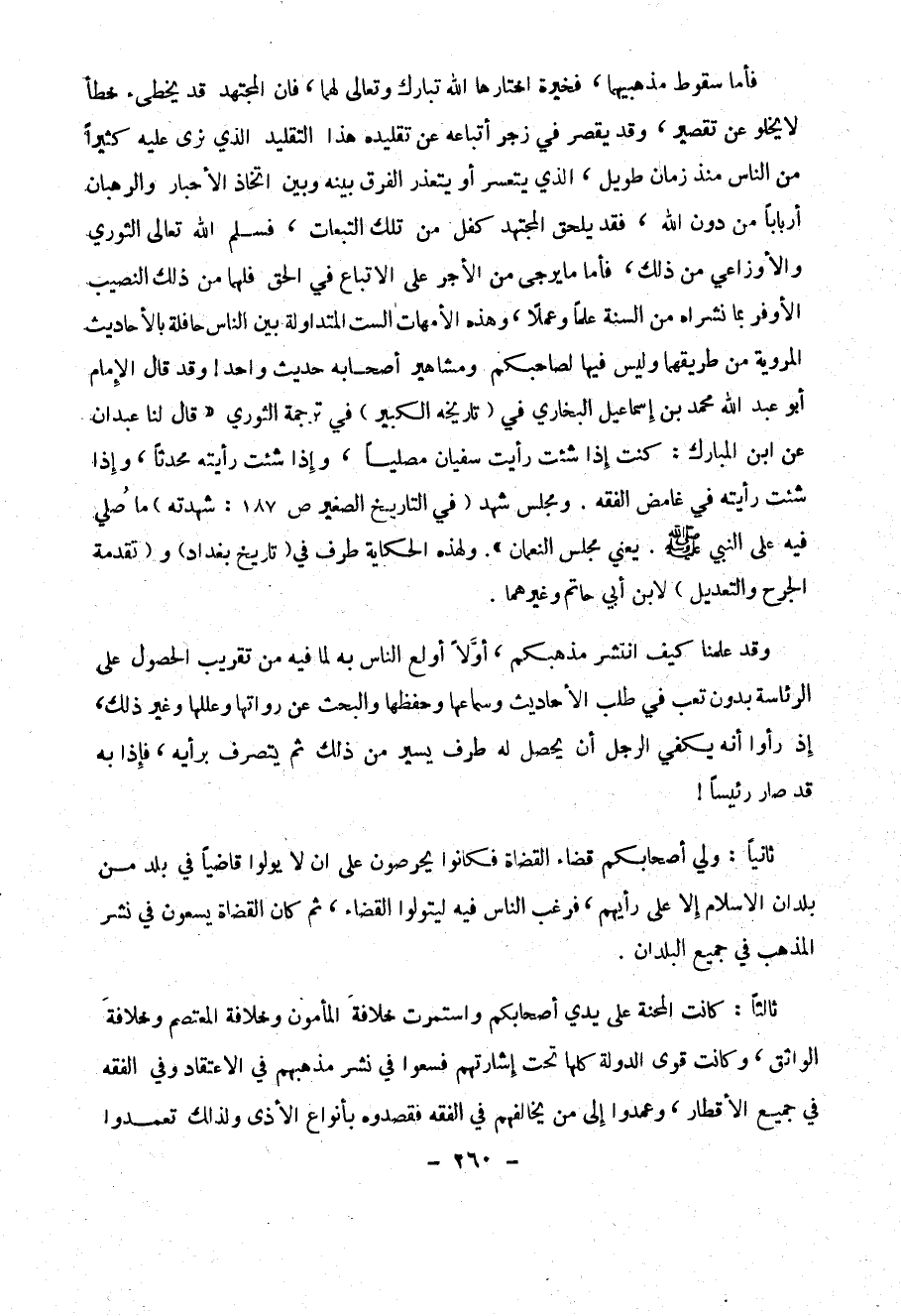 فأما سقوط مذهبيهما ، فخيرة اختارها الله تبارك وتعالى لهما ، فان المجتهد قد يخطئ خطأ لا يخلو عن تقصير ، وقد يقصر في زجر أتباعه عن تقليده هذا التقليد الذي نرى عليه كثيراً من الناس منذ زمان طويل ، الذي يتعسر أو يتعذر الفرق بينه وبين اتخاذ الإجبار والرهبان أرباباً من دون الله ، فقد يلحق المجتهد كفل من تلك التبعات ، فسلم الله تعالى الثوري والأوازعي من ذلك ، فأما ما يرجى من الأجر على التباع في الحق فلهما من ذلك النصيب الأوفر بما نشراه من السند علماً وعملاً ، وهذه الأمهات الست المتدالة بين الناس حافلة بالأحاديث المروية من طريقهما وليس فيها لصاحبكم ومشاهير أصحابه حديث واحد ! وقد قال افمام أبو عبد الله محمد بن إسماعيل البخاري في ( تاريخه الكبير ) في ترجمة الثوري (( قال لنا عبدان عن ابن المبارك : كنت إذا شئت رأيت سفيان مصلياً ، وإذا شئت رايته محدثاً ، وإذا شئت رأيته في غامض الفقه . ومجلس شهد ( في التاريخ الصغير ص 187 : شهدته ) ما صلي فيه على النبي - صلى الله عليه وسلم - . - يعني مجلس النعمان )) ولهذه الحكاية طرف في ( تاريخ بغداد ) و( تقدمه الجرح والتعديل ) لابن أبي حاتم وغيرهما .
