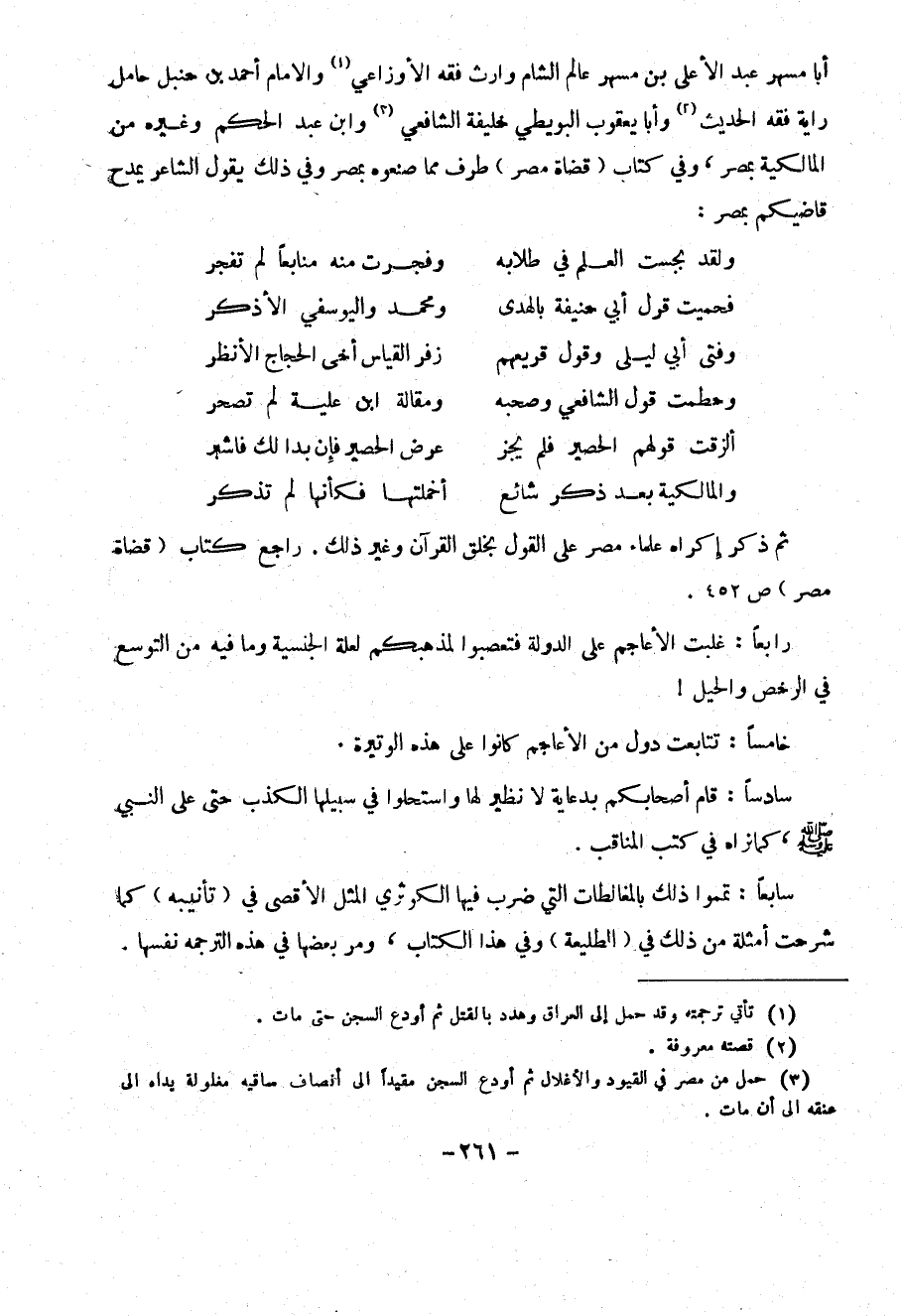 أبا مسهر عبد الأعلى بن مسهر عالم الشام وارث فقه الأوزاعي (1) وافمام أحمد بن حنبل حامل راية فقه الحديث (2) وأبا يعقوب البويطي خليفة الشافعي (3) وابن عبد الحكيم وغيره من المالكية بمصر ، وفي كتاب ( قضاة مصر ) طرف مما صنعوه بمصر وفي ذلك يقول الشاعر يمدح قاضيكم بمصر :