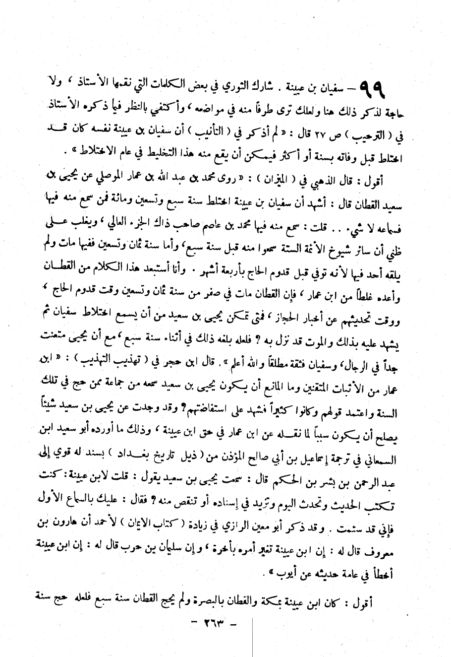 99- سفيان بن عيينة . شارك الثوري في بعض الكلمات التي نقمها الأستاذ ، ولا حاجة لذكر ذلك هنا ولعلك ترى طرفاط منه في مواضعه ، وأكتفى بالنظر فيما ذكره الأستاذ في ( الترحيب ) ص 27 قال : (( لم اذكر في ( التأنيب ) أن سفيان بن عيينة نفسه كان قد اختلط قبل وفاته بسنة أو أكثر فيمكن أن يقع منه هذا التخطيط في عام الاختلاط)) .