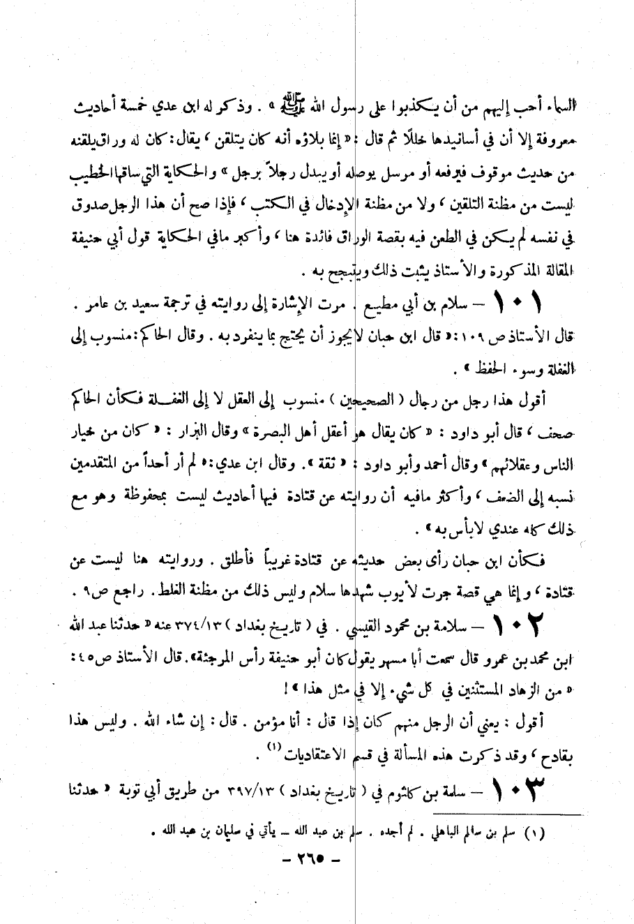 102- سلامة بن محمود القيسي . في ( تاريخ بغداد ) 13/374 عنه (( حدثنا عبد الله بن محمد بن عمرو قال سمعت أبا مسهر يقول كان أبو حنيفة رأس المرجئة )) قال الأستاذ ص 445 (( من الزهاد المستثنين في كل شيء إلا في مثل هذا )) !