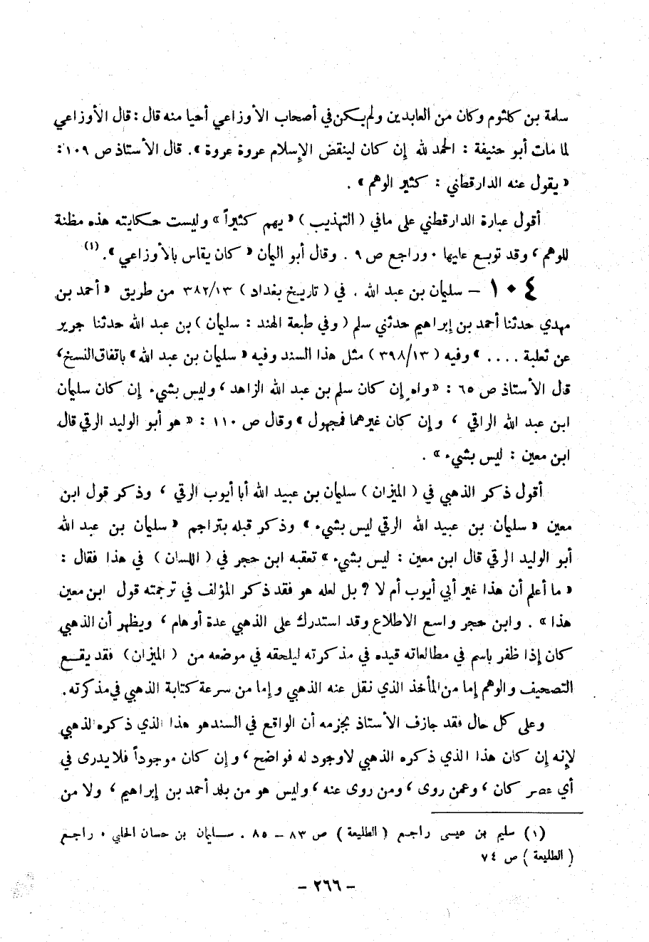 أقول ذكر الذهبي في ( الميزان ) سليمان بن عبيد الله أبا أيوب الرقي ، وذكر قول ابن معين (( سليمان بن عبيد الله الرقي ليس بشيء )) وذكر قبله بتراجم (( سليمان بن عبد الله أبو الوليد القي قال ابن معين : ليس بشيء تعقبه ابن حجر في ( اللسان ) في هذا فقال : (( ما أعلم أن هذا غير أبي أيوب أم لا ؟ بل لعله هو فقد ذكر المؤلف في ترجمته قول ابن معين هذا )) . وابن حجر واسع الإطلاع وقد استدرك على الذهبي عدة أوهام ، ويظهر أن الذهبي كان إذا ظفر باسم في مطالعاته قيده في مذكراته ليلحقه في موضعه من ( الميزان ) فقد يقع التصحيف والوهم إما من المأخذ نقل عنه الذهبي وغما من سرعة كتابة الذهبي في مذكرته . وعلى كل كال فقد جازف الأستاذ بجزمه أن الواقع في السند هو هذا الذي ذكره الذهبي لأنه إن كان هذا الذي ذكره الذهبي لا وجود له فواضح ، وإن كان موجوداً فلا يدري في أي عصر كان ، وعمن روى ، ومن روى عنه ، وليس هو من بلد أحمد بن إبراهيم ، ولا من
