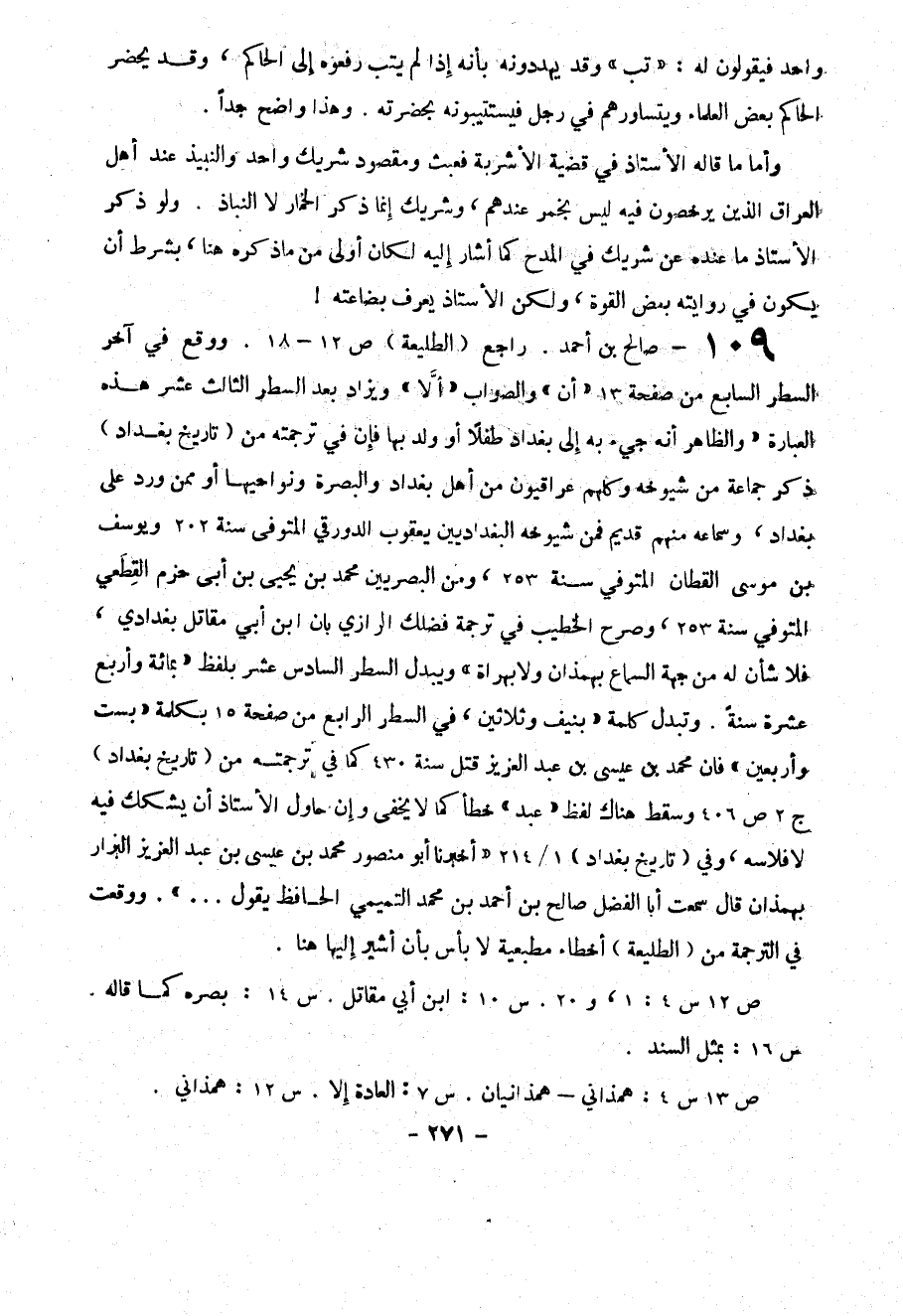 109-صالح بن أحمد . راجع ( الطليعة ) ص 12 – 18 . ووقع في آخر السطر السابع من صفحة 13 (( أن )) والصواب (( ألاّ )) ويزاد بعد السطر الثالث عشر هذه العبارة (( والظاهر أنه جيء به إلى بغداد طفلا أو ولد بها فإن في ترجمته من ( تاريخ بغداد ) ذكر جماعة من شيوخه وكلهم عراقيون من أهل بغداد والبصرة ونواحيها أو ممن ورد على بغداد ، وسماعه منهم قديم فمن شيوخه البغداديين يعقوب الدورقي المتوفى سنة 202 ويوسف بن موسى القطان المتوفى سنة 253 ، ومن البصريين محمد بن يحيى بن أبي حزم القطعي المتوفى سنة 253 وصرح الخطيب في ترجمة فضلك الرازي بان أبي مقاتل بغدادي ، فلا شأن له من جهة السماع بهمذان ولا بهراة )) ويبدل السطر الرابع من صفحة 15 بكلمة (( بست وأربعين )) فان محمد بن عيسى بن عبد العزيز قتل سنة 430 كما في ترجمته من ( تاريخ بغداد ) ج 2 ص406 وسقط هناك لفظ (( عبد )) خطأ كما لا يخفى وإن حاول الأستاذ أن يشكك فيه لإفلاسه ، وفي ( تاريخ بغداد ) 1 / 214 (( أخبرنا أبو منصور محمد بن عيسى بن عبد العزيز البزار بهمذان قال سمعت آبا الفضل صالح بن أحمد بن محمد التميم الحافظ يقول ... )) . ووقعت في الترجمة من ( الطليعة ) أخطأ مطبعية لابأس بأن أشير إليها هنا .