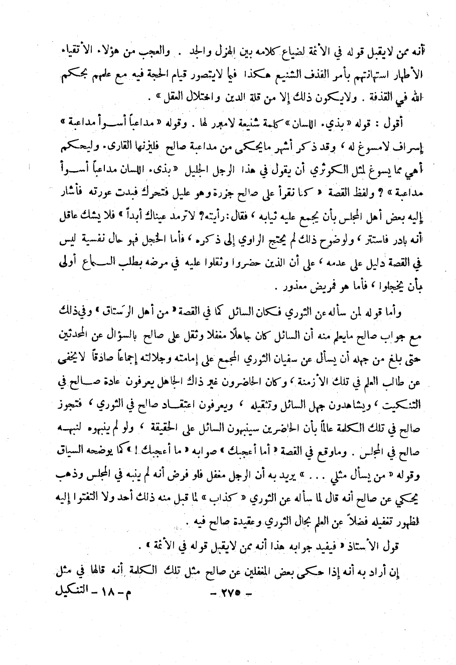 وأما قوله لمن سأله عن الثوري فكان السائل كما في القصة (( من أهل الرستاق )) وفي ذلك مع جواب صالح ما يعلم منه أن السائل كان جاهلاً مغفلاً وثقل على صالح بالسؤال عن المحدثين حتى بلغ من جهله أن يسأل عن سفيان الثوري المجمع على إمامته وجلالته إجناعاً صادقا لا يخفى عن طالب العلم في تلك الأزمنة ، وكان الحاضرون غير ذاك الجاهل يعرفون عادة صالح في التنكيت ، ويشاهدون جهل السائل وتثقيلة ، ويعرفون اعتقاد صالح في الثوري ، فتجوز صالح في تلك الكلمة عالما بأن الحاضرون سينهبون السائل على الحقيقة ، ولم يوضحه السياق وقوله (( من يسال مثلي )) ... )) يريد به أن الرجل مغفل فلو فرض أنه لم ينبه في المجلس وذهب يحكي عن صالح انه قال لما سأله عن الثوري (( كذاب )) لما قبل منه ذلك أحد ولا التفتوا غليه لظهور تغفيله عن العلم بحال الثوري وعقيدة صالح فيه .