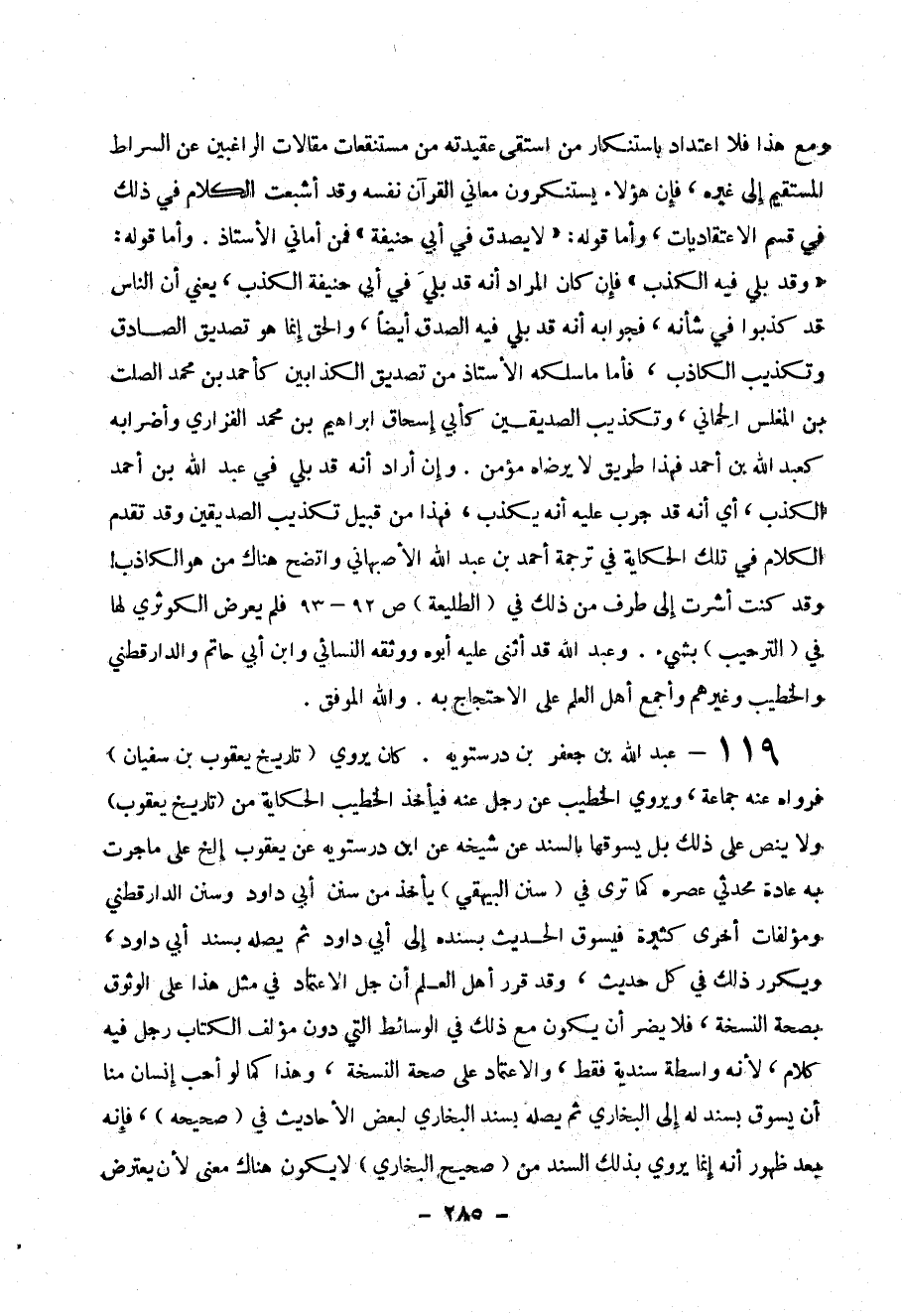 119- عبد الله بن جعفر بن درستويه . كان يروي ( تاريخ يعقوب بن سفيان ) فرواه عن جماعة ، ويروي الخطيب عن رجل عنه فيأخذ الخطيب الحكاية من ( تاريخ يعقوب ) ولا ينص على ذلك بل يسوقها بالسند عن شيخه عن ابن درستويه عن يعقوب الخ على ما جرت به عادة محدثي عصره كما ترى في ( سنن البيهقي ) يأخذ من سنن أبي داود وسنن الدر اقطني ومؤلفات أخرى كثيرة فيسوق الحديث بسنده إلى أبي داود ثم يصله بسند أبي داود ، ويكرر ذلك في كل حديث ، وقد قرر أهل العلم أن جل الاعتماد في مثل هذا على الوثوق بصحة النسخة ، فلا يضر أن يكون مع ذلك في الوسائط التي دون مؤلف الكتاب رجل فيه كلام ، لأنه واسطة سندية فقط ، والاعتماد على صحة النسخة، وهذا كما لو أحب إنسان منا أن يسوق بسند له إلى البخاري ثم يصله بسند البخاري لبعض الأحاديث في ( صحيحة ) ، فإنه بعد ظهور أنه إنما يروي بذلك السند من ( صحيح البخاري ) لا يكون هناك معنى لأن يعترض