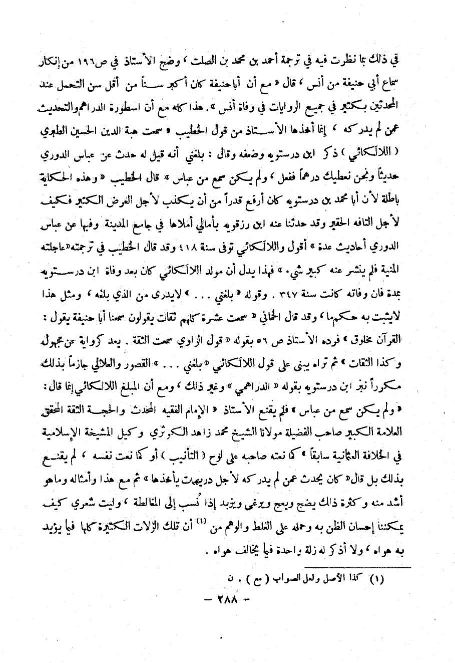 في ذلك بما نظرت فيه في ترجمة أحمد بن محمد بن الصلت ، وضج الأستاذ في ص196 من إنكار سماع بي حنيفة من أنس ، قال (( مع أن أبا حنيفة كان أكبر سناً من أقل سن التحمل عند المحدثين بكثير في جميع الروايات في وفاة أنس )) . هذا كله مع أن أسطورة الدراهم والتحديث عمن لم يدركه ، وإنما أخذها الأستاذ من قول الخطيب (( سمعت هبة الدين الحسين الطبري ( اللآلكائي ) ذكر ابن درستويه وضعفه وقال : بلغني أنه قيل له حدث عن عباس الدوري حديثاً ونحن نعطيك درهماًُ ففعل ، ولم يكن سمع من عباس )) قال الخطيب (( وهذه الحكاية باطلة لأن أبا محمد بن درستويه كان أرفع قدراً من أن يكذب لأجل العرض الكثير فكيف لأجل التافه الحقير وقد حدثنا عنه ابن رزقويه بآمالي أملاها في جامع المدينة وفيها عن عباس الدوري أحاديث عدة )) أقول واللآلكائي توفي سنة 418 وقد قال الخطيب في ترجمته (( عاجلته المنية فلم ينشر عنه كبير شيء )) فهذا يدل أن مولد اللآلكائي كان بعد وفاة ابن درستويه بمدة فإن وفاته كانت سنة 347 . وَقَوْلُه (( بلغني ... )) لا يدري من الذي بلغه، ومثل هذا لا يثبت به حكم ما ، وقد قال الحماني (( سمعت عشرة كلهم ثقات يقولون سمعنا أبا حنيفة يقول : القرآن مخلوق )) فرده لأستاذ ص56 بقوله (( قول الراوي سمعت الثقة . يعد كرواية عن مجهول وكذا الثقات )) ثم تراه يبني على قول اللآلكائي ((بلغني ... )) القصور والعلالي جازماً بذلك مكرراً نبز ابن درستويه بقوله (( الدراهمي )) وغير ذلك ، ومع أن المبلغ اللآلكائي إنما قال : (( ولم يكن سمع من عباس )) فلم يقنع الأستاذ (( الإمام الفقيه المحدث والحجة الثقة المحقق العلامة الكبير صاحب الفضيلة مولانا الشيخ محمد زاهد الكوثري وكيل المشيخة الإسلامية في الخلافة العثمانية سابقاً )) كما نعته صاحبه على لوح ( التأنيب ) أو كما نعت نفسه ، ولم يقنع ، لم يقنع أشد منه وكثرة ذلك يضج ويعج ويرغى ويزيد إذا نُسب إلى المغالطة ، وليت شعري كيف يمكننا إحسان الظن به وحمله على الغلظ والوهم من (1) أن تلك الزلات الكثيرة كلها فيما يؤيد به هواه ، ولا أذكر له زلة واحدة فيما يخالف هواه .