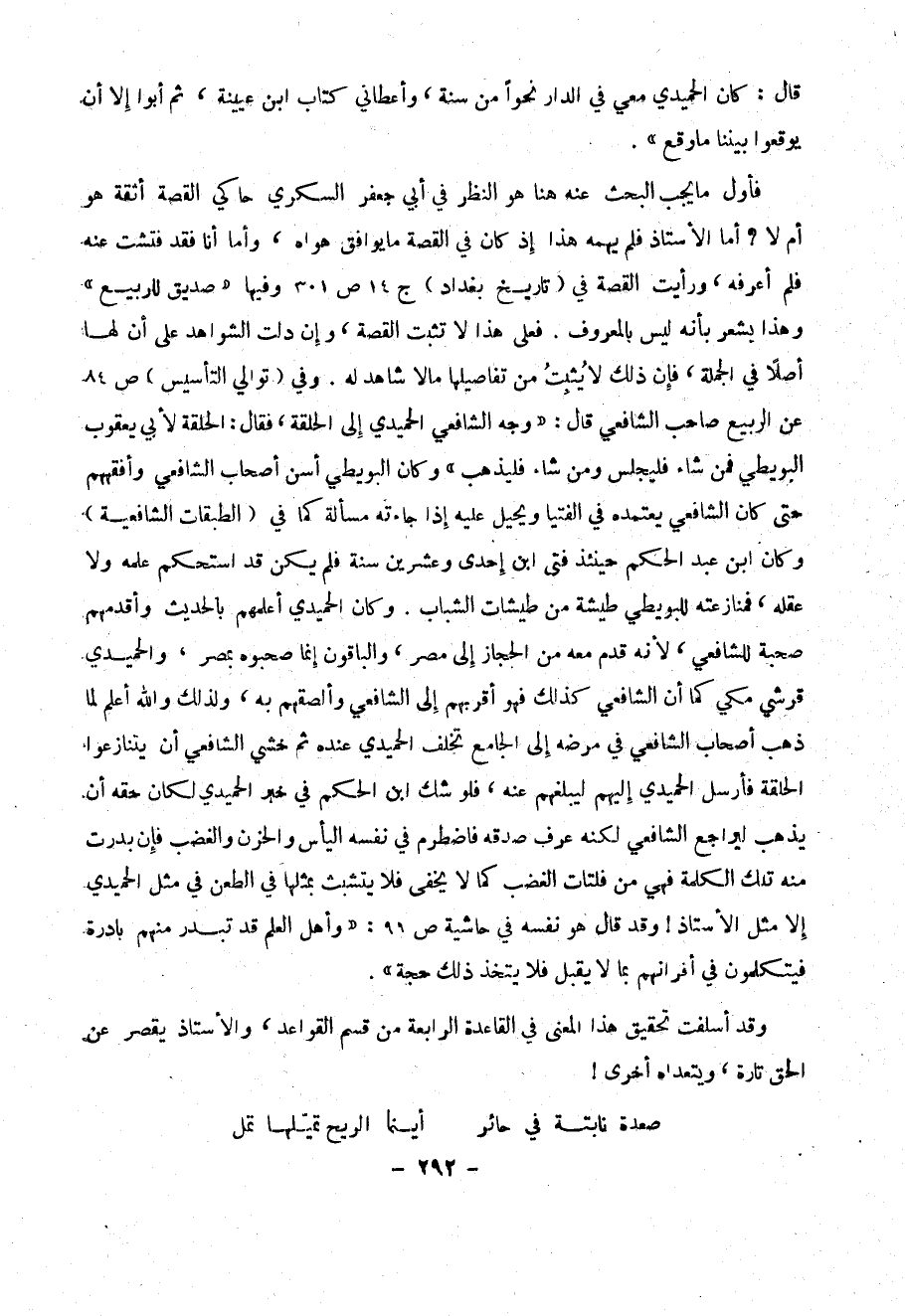 فأول ما يجب البحث عنه هنا هو النظر في أبي جعفر السكري حاكي القصة أثقة هو أم لا ؟ أما الأستاذ فلم يهمه هذا إذ كان في القصة ما يوافق هواه ، وأما أنا فقد فتشت عنه فلم أعرفه، ورأيت القصة في ( تاريخ بغداد ) ج14 ص301 وفيها (( صديق للربيع )) وهذا يشعر أنه ليس بالمعروف . فعلى هذا لا تثبت القصة ، وإن دلت الشواهد على أن لها أصلاً في الجملة ، فإن ذلك لا يُثبت من تفاصيلها ما لا شاهد له . وفي ( توالي التأسيس ) ص84 عن الربيع صاحب الشافعي قال :(( وجه الشافعي الحميدي إلى الحلقة ، فقال : الحلقة لأبي يعقوب البويطي فمن شاء فليجلس ومن شاء فليذهب )) وكان البويطي أسن أصحاب الشافعي وأفقههم حتى كان الشافعي يعتمده في الفتيا ويحيل عليه إذا جاءته مسألة كما في ( الطبقات الشافعية ) وكان ابن عبد الحكم حينئذ فتى ابن إحدى وعشرين سنة فلم يكن قد استحكم علمه ولا عقله، فمنازعته للبويطي طيشة من طيشات الشباب. وكان الحميدي أعلمهم بالحديث وأقدمهم صحبة للشافعي ، لأنه قدم معه من الحجاز إلى مصر ، والباقون إنما صحبوه بمصر ، والحميدي قرشي مكي كما أن الشافعي كذلك فهو أقربهم إلى الشافعي وألصقهم به ، ولذلك والله أعلم لما ذهب أصحاب الشافعي في مرضه إلى الجامع تخلف الحميدي عنهه ثم خشي الشافعي أن يتنازعوا الحلقة فأرسل الحميدي إليهم ليبلغهم عنه ، فلو شك ابن الحكم في خبر الحميدي لكان حقه أن يذهب ليراجع الشافعي لكنه عرف صدقه فاضطرم في نفسه اليأس والحزن والغضب وإن بدرت منه تلك الكلمة فهي من فلتات الغضب كما لا يخفى فلا يتشبث بمثلها في الطعن في مثل الحميدي إلا مثل الأستاذ ! وقد قال هو نفسه في حاشية ص99 : (( وأهل العلم قد تبدر منهم بادرة فيتكلمون في أقرانهم بما لا يقبل فلا يتخذ ذلك حجة )) .