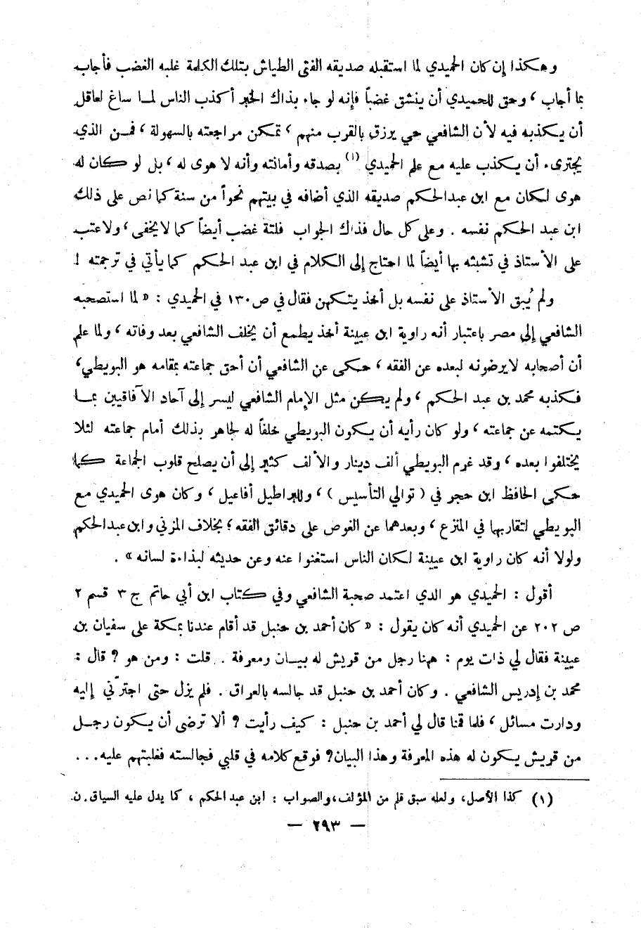 وهكذا إن كان الحميدي لما استقبله صديقه الفتى الطياش بتلك الكلمة غلبه الغضب فأجاب بما أجاب ، وحق للحميدي أن ينشق غضباً فإنه لو جاء بذاك الخبر أكذب الناس لما ساغ لعاقل أن يكذبه فيه لأن الشافعي حي يرزق بالقرب منهم ، تمكن مراجعته بالسهولة ، فمن الذي يجترئ أن يكذب عليه مع علم الحميدي (1) بصدقه وأمانته وأنه لا هوى له ، بل لو كان له هوى لكان مع ابن الحكم صديقه الذي أضافه في بيتهم نحواً من سنة كما نص على ذلك ابن عبد الحكم نفسه . وعلى كل حال فذاك الجواب فلتة غضب أيضاً كما لا يخفى ، ولا عتب على الأستاذ في تشبثه به أيضاً لما احتاج إلى الكلام في ابن عبد الحكم كما يأتي في ترجمته !