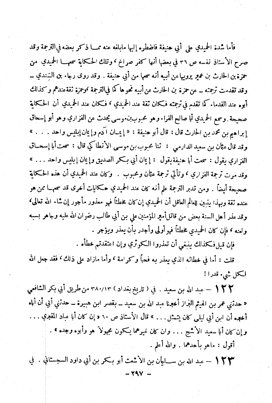 فأما شدة الحميدي على أبي حنيفة فاضطره إليها ما بلغه عنه مما ذكر بعضه في الترجمة وقد صرح الاستاذ نفسه ص 36 في بعضها أنه كفر صرخ ، وتلك الحكاية سمعها الحميدي من حمزة بن الحارث بن عمير يرويها عن أبيه أنه سمعها من أبي حنيفة . وقد روى رجاء بن السندي – وقد تقدمت ترجمته – عن حمزة بن الحارث عن أبيه نحوها كما في الترجمة ، وحمزة ثقة عندهم وكذلك أبوه عند القدماء كما تقدم في ترجمته فكان ثقة عند الحميدي ، فكان عند الحميدي أن الحكاية صحيحة . وسمع الحميدي أبا صالح الفراء وهو محبوب بن موسى يحدث عن الفزاري وهو أبو إسحاق إبراهيم بن محمد بن الحارث قال : قال أبو حنيفة : (( إيمان آدم وإيمان إبليس واحد ... )) وقد قال عثمان بن سعيد الدارمي : ثنا محبوب ين موسى الأنطاكي قال : سمعت أبا إسحاق الفزاري يقول : سمعت أبا حنيفة يقول : (( إيمان أبي بكر الصديق وإيمان أبي بكر واحد ... )) وقد مرت ترجمة الفزاري ، وتأتي ترجمة عثمان وحبوب . وكان عند الحميدي أن هذه الحكاية صحيحة أيضاً . ومن تدبر الترجمة علم أنه كان عند الحميدي حكايات أخرى قد سمعها ممن هو عنده ثقة وبهذا يتبين للعالم العاقل أن الحميدي إن كان مخطئاً فهو معذور مأجور إن شاء الله تعالى . وقد عذر أهل السنة بعض من قاتل أمير المؤمنين علي بن أبي طالب رضوان الله عليه وجاهر بسبه ولعنه ، فإن كان الحميدي مخطئاً فهو أولى وأجدر بأن يعذر ويؤجر .