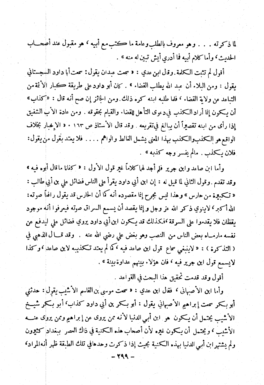 أقول لم تثبت الكلمة . وقال ابن عدي : (( سمعت عبدان يقول : سمعت أبا داود السجستاني يقول : ومن البلاء أن عبد الله يطلب القضاء )) . كان أبو داود على طريقة كبار الأئمة من التباعد عن ولاية القضاء ، فلما طلبه ابنه كره ذلك ومن الجائز إن صح أنه قال : (( كذاب )) أن يكون إنما أراد الكذب في دعوى التأهل للقضاء والقيام بحقوقه. ومن عادة الأب الشفيق إذا رأى من ابنه تقصيراً أن يبالغ في تقريعه . وقد قال الأستاذ ص163 . (( الإخبار بخلاف الواقع هو الكذب والكذب بهذا المعنى يشمل الغالط والواهم ... فلا يعتد بقول من يقول : فلان يكذب . ما لم يفسر وجه كذبه )) .