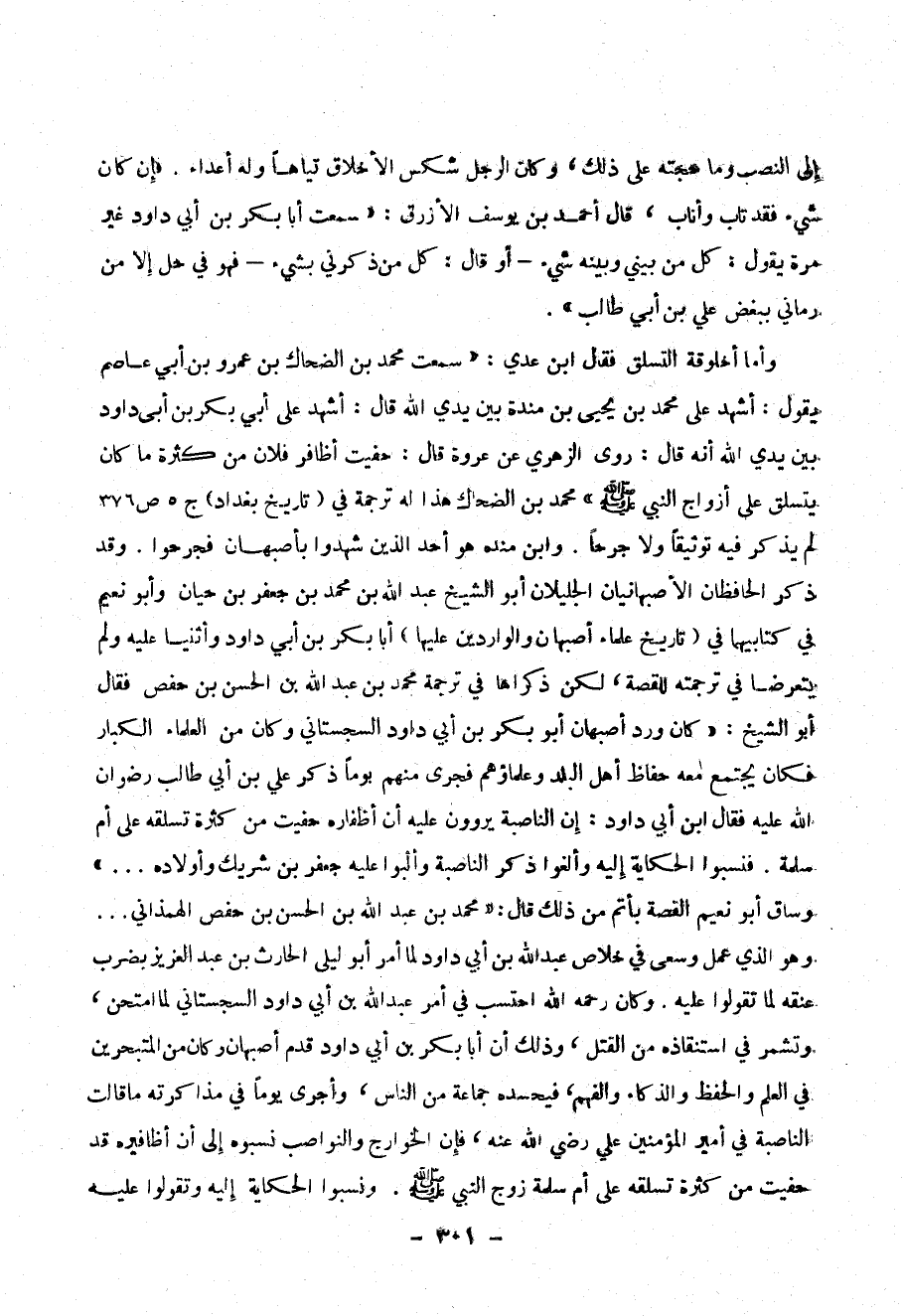 إلى النصب وما حجته في ذلك ، وكان الرجل شكس الأخلاق تياهاً وله أعداء . فإن كان شيء فقد تاب وأناب ، قال أحمد يوسف الأزرق : (( سمعت أبا بكر بن أبي داود غير مرة يقول : كل من بيني وبينه شيء – أو قال : كل من ذكرني بشيء – فهو في حل إلا من رماني ببغض علي بن أبي طالب )) .